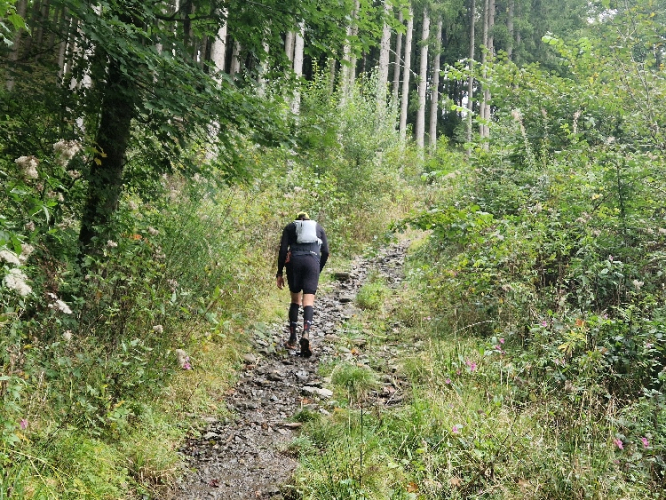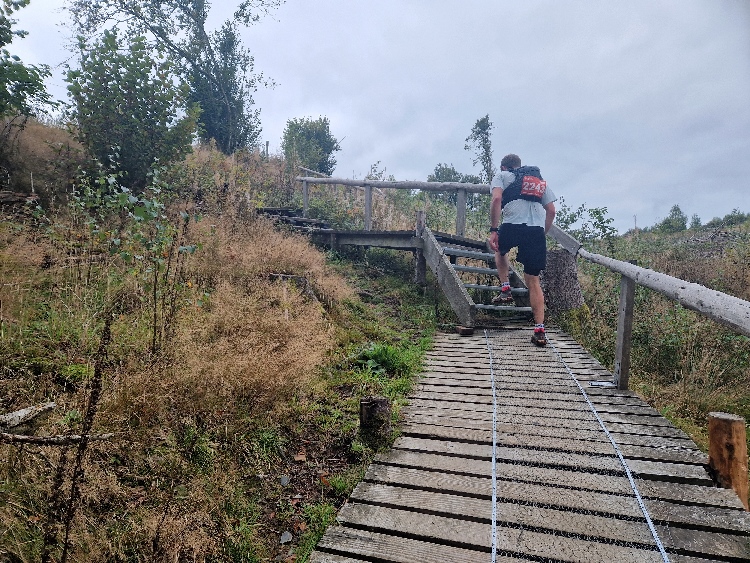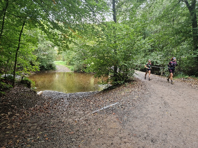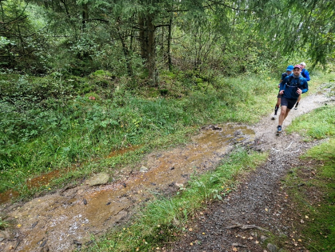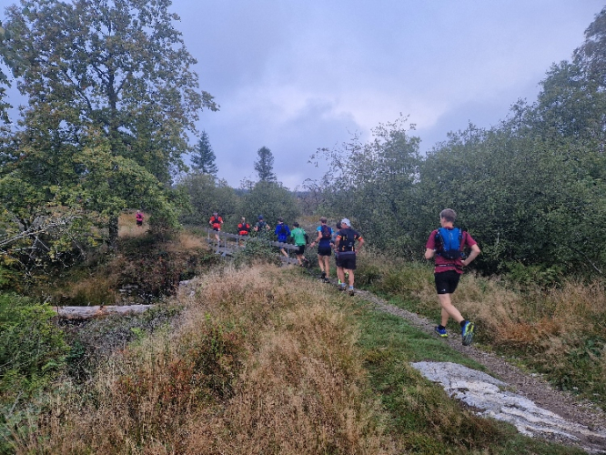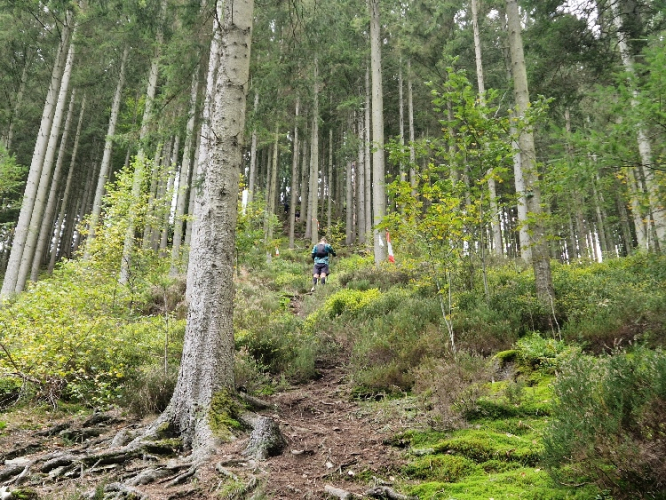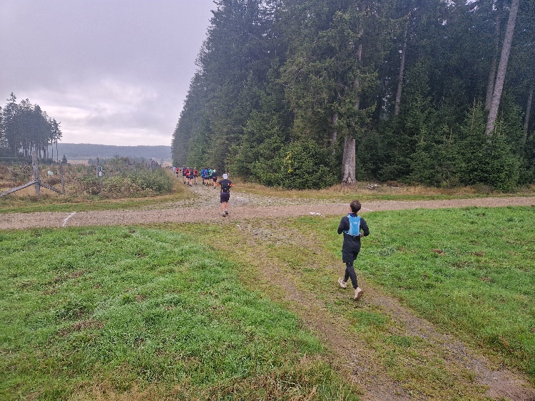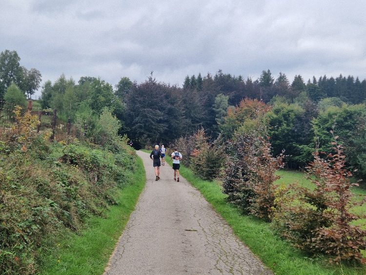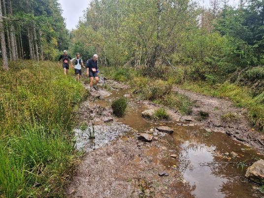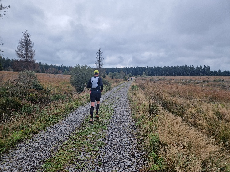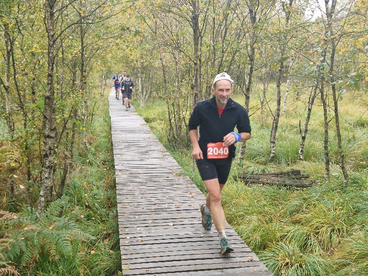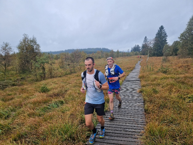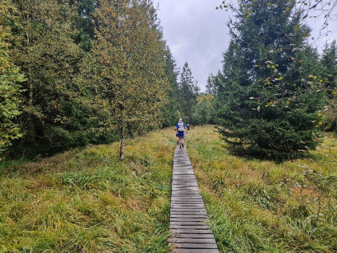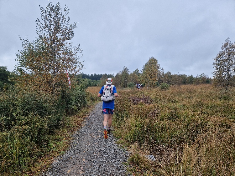 Um 9 Uhr geht es los. Die Geschwindigkeit auf den ersten 21 km ist recht hoch und es ist gar nicht so einfach. Teilweise Schlamm, teilweise Wurzeln, teilweise Steine, teilweise lange Stege über die Moor- und Heidelandschaft der Hautes Fagnes (Hohes Venn), nur eine halbe Stunde von der Grenze zu Deutschland. Man merkt, dass hier über 200 Leute gleichzeitig losgelaufen sind, denn meist ist der Weg schmal und daher ausgetreten. Da es aber keine großen Steigungen gibt, entsteht auch nirgends Stau, man ordnet sich in der ersten halben Stunde einfach nach Geschwindigkeit.