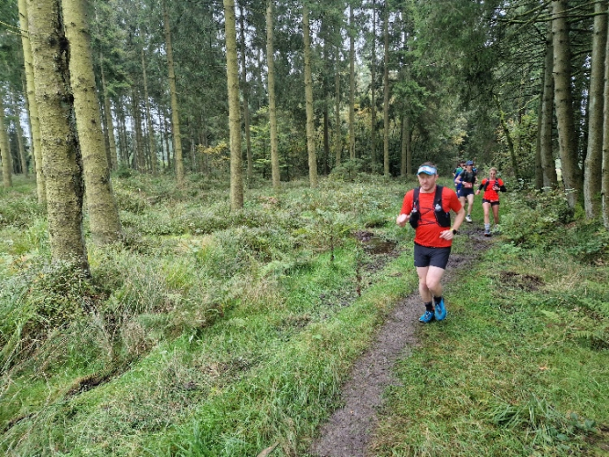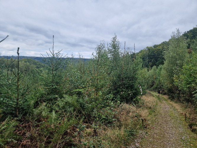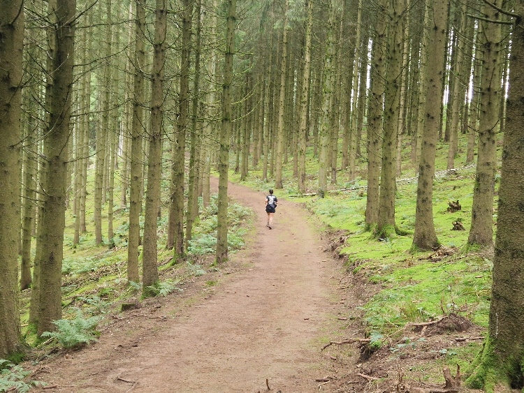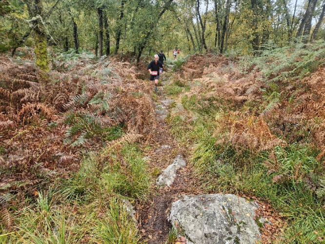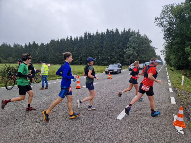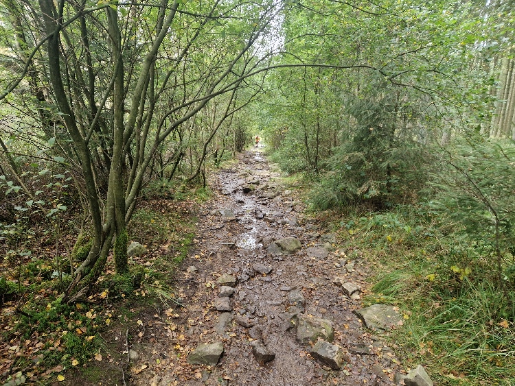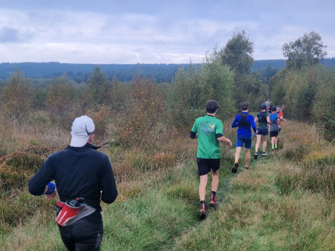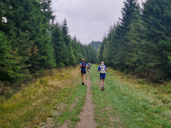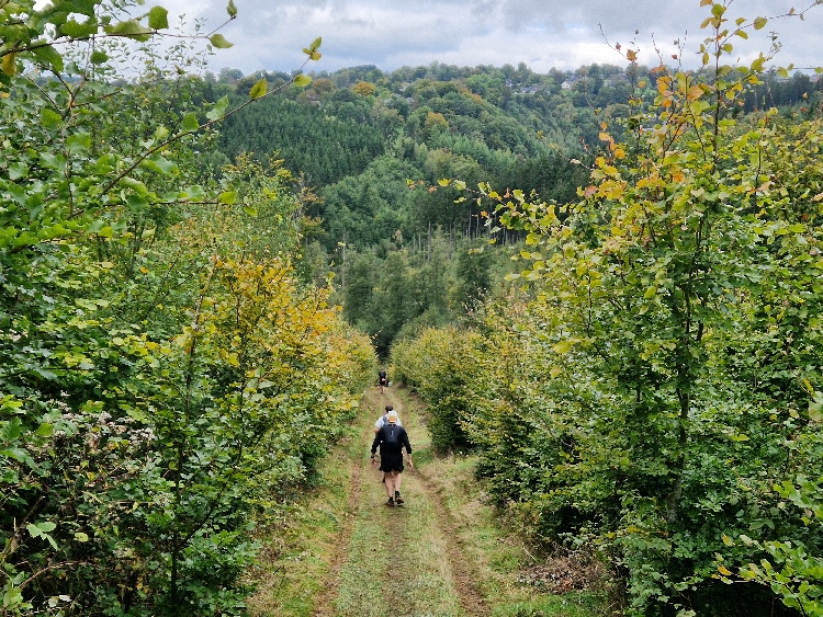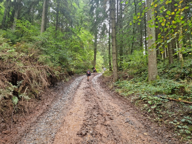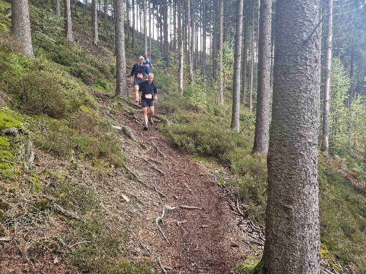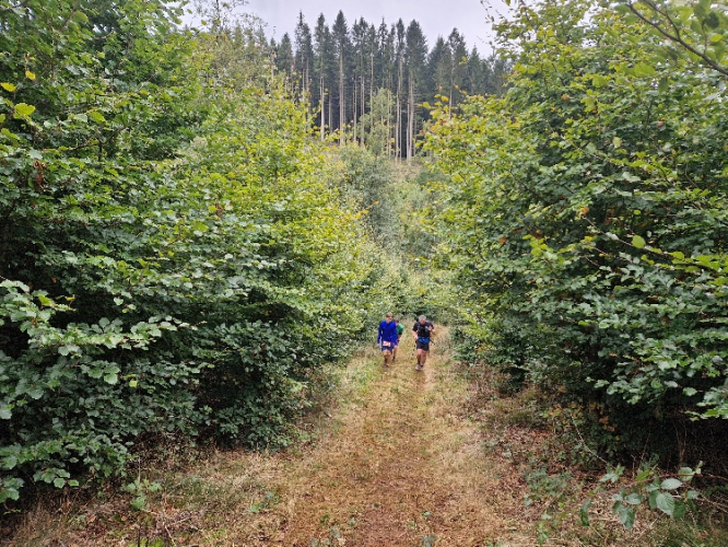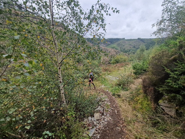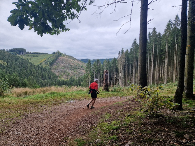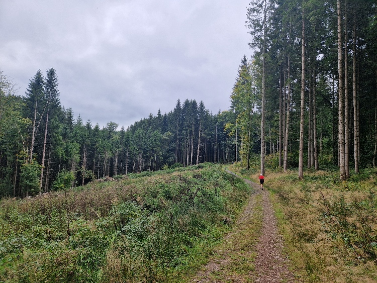 Um 9 Uhr geht es los. Die Geschwindigkeit auf den ersten 21 km ist recht hoch und es ist gar nicht so einfach. Teilweise Schlamm, teilweise Wurzeln, teilweise Steine, teilweise lange Stege über die Moor- und Heidelandschaft der Hautes Fagnes (Hohes Venn), nur eine halbe Stunde von der Grenze zu Deutschland. Man merkt, dass hier über 200 Leute gleichzeitig losgelaufen sind, denn meist ist der Weg schmal und daher ausgetreten. Da es aber keine großen Steigungen gibt, entsteht auch nirgends Stau, man ordnet sich in der ersten halben Stunde einfach nach Geschwindigkeit.