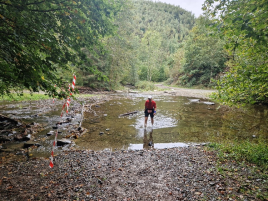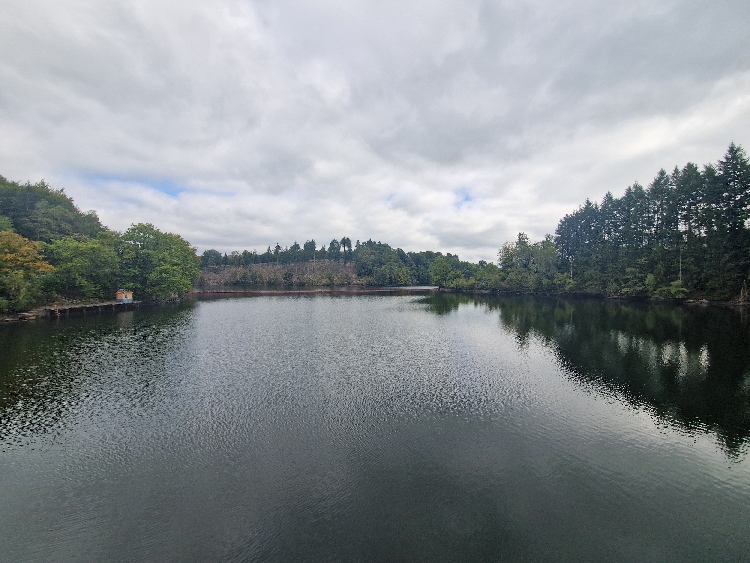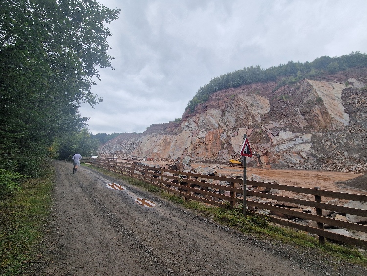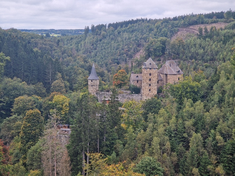 Und es gab sie auch, die Highlights, wie man sie vom Grand Trail des Lacs & Châteaux kennt: Zwei Flussdurchquerungen (und zwei optionale) – obwohl es nicht warm war, ist man doch recht schnell getrocknet. Dazu der Lac (Lac de Robertville mit eindrucksvollem Staudamm) und das Châteaux (Burg Reinhardstein). Dazu noch ein Steinbruch, über dessen Gelände man kurz läuft. Und auf den letzten Kilometern öffnete sich sogar ein kleines Fenster im Himmel und die Sonne strahlte genau auf den Hügel mit dem Skilift von Ovifat, wo der Grand Trail des Lacs & Châteaux startet. Vielleicht ein Zeichen?