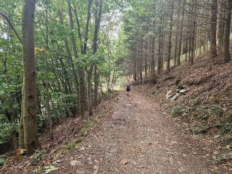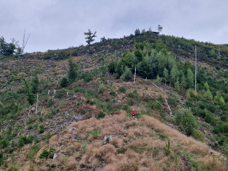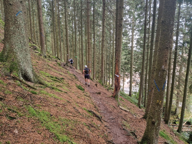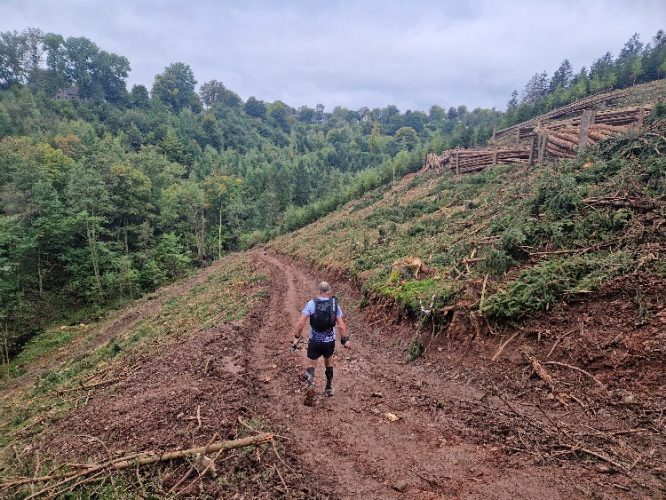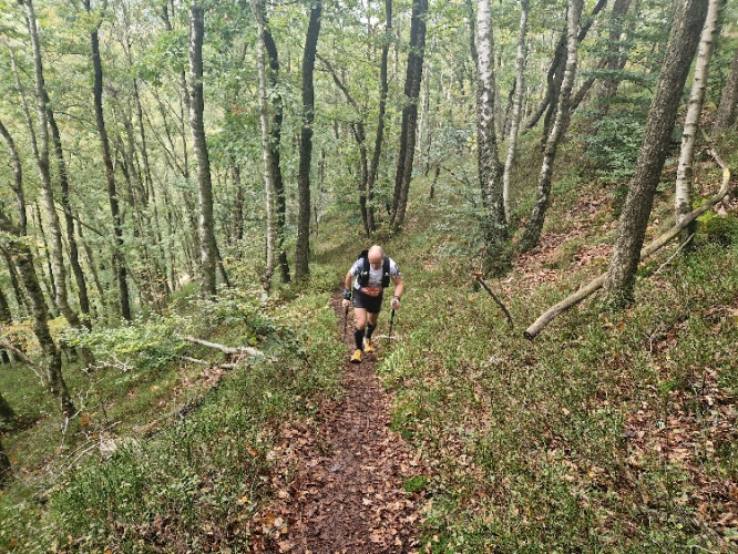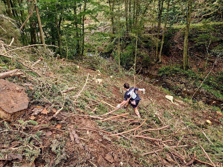 Und dann kommt es dicke. Bei dem Posten bei Kilometer 33 bin ich wirklich glücklich, einmal Pause machen zu können. Einerseits sind da die Höhenmeter an sich. Andererseits bestehen die Steigungen aus kurzen Abschnitten mit je 100-200 Höhenmetern und einer Steigung von 20-35%. Und danach geht es meist genauso runter. Ich bin also recht froh, doch meine Stöcke im Köcher dabei zu haben, an einigen Stellen ist man aber eher am Klettern als am Gehen, Laufen geht sowieso nicht oder ist aufgrund des Abhangs mir persönlich zu gefährlich.