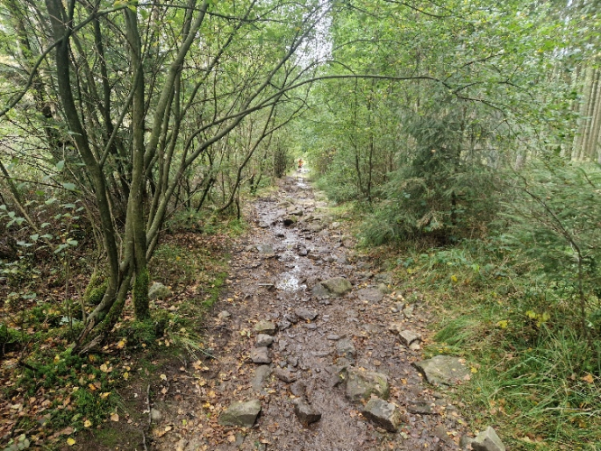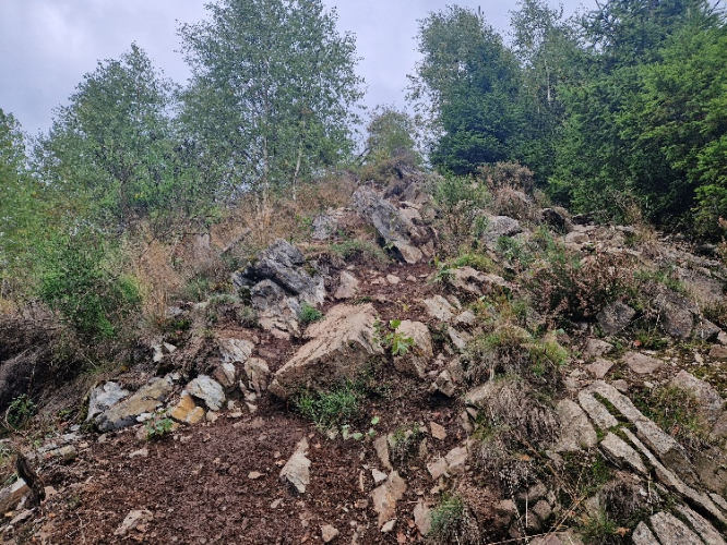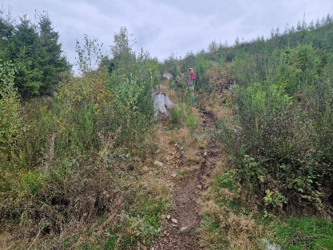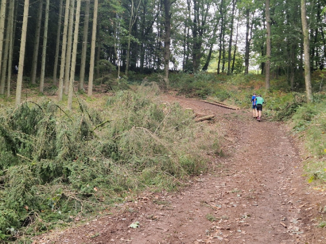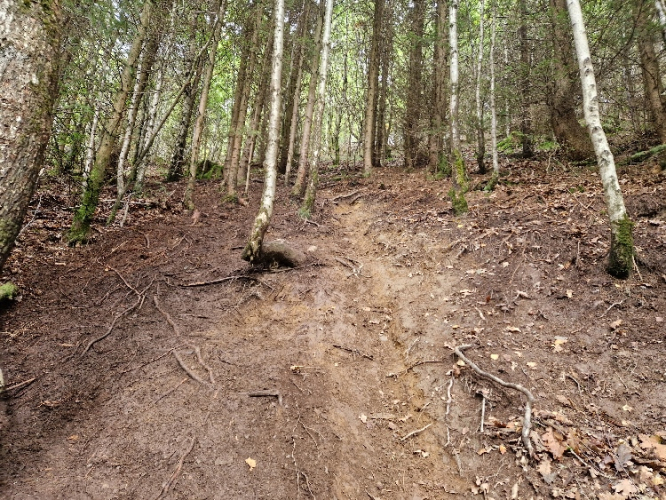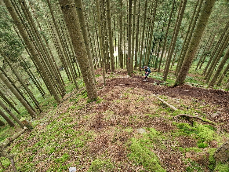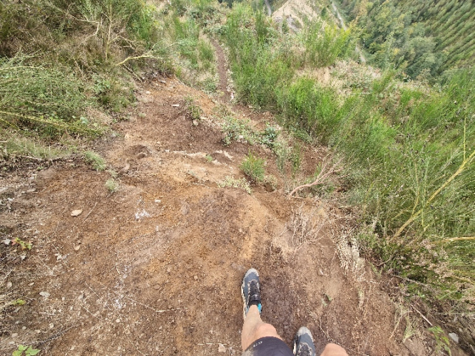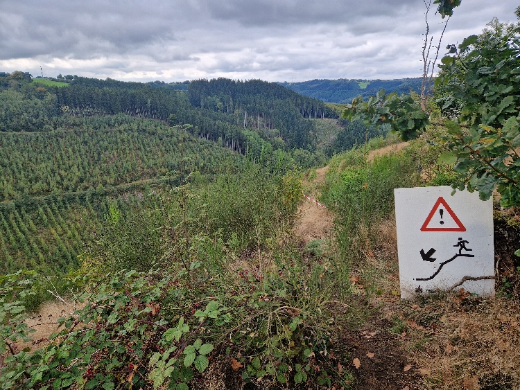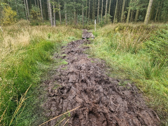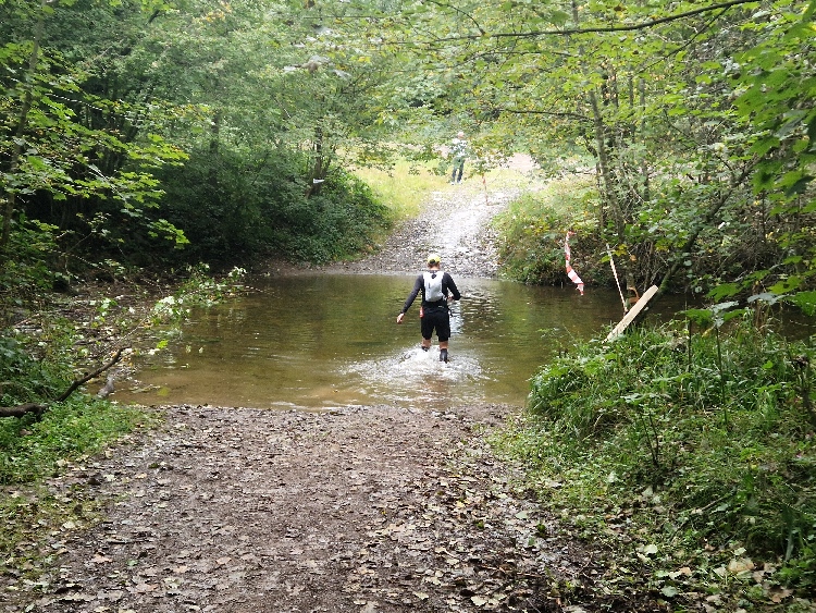 September heißt manchmal auch kühleres Wetter, so dass wir tatsächlich morgens bei 11 Grad loslegen. Aber es regnet nicht und der Grund ist nur auf der flacheren Strecke teilweise extrem matschig, so dass man gerade an den steilen Stücken nicht immer einen sicheren Halt hat. Matschig heißt ja nicht primär dreckig, sondern vor allem rutschig, so dass es mich sogar einmal bei einem mutigen aber zu kurzen Sprung voll erwischt hat.