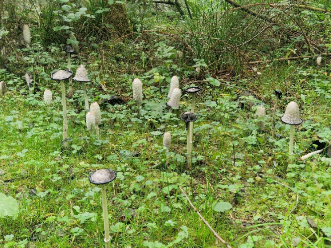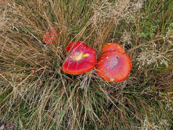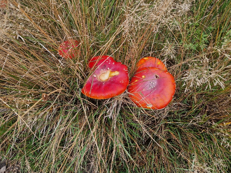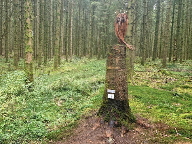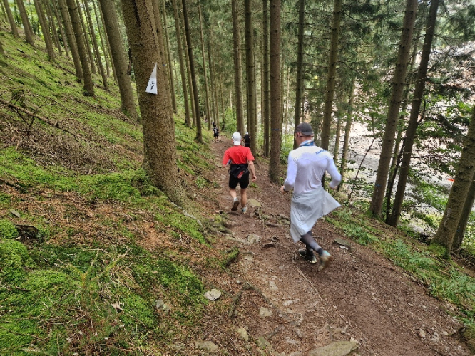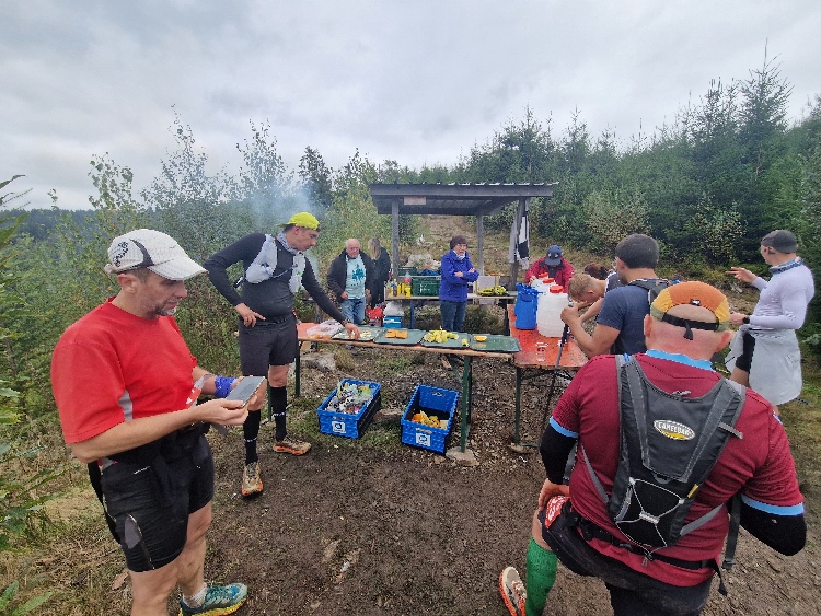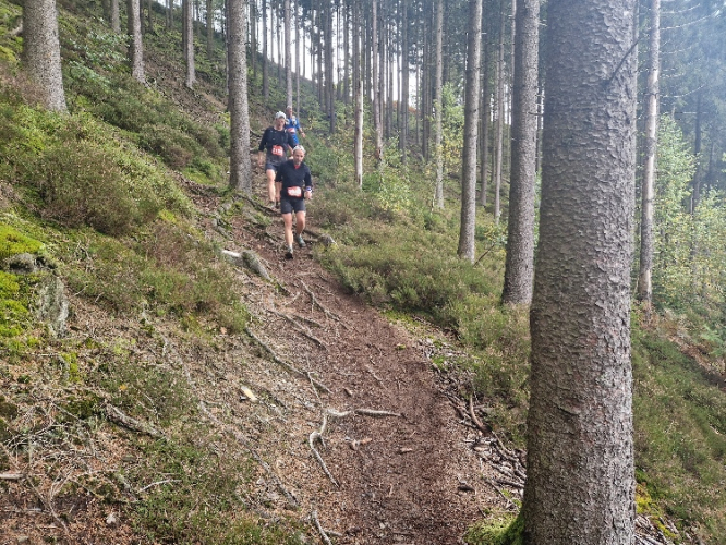 Dazu gibt es einige Kunstwerke am Wegesrand und einige Erklärtafeln zu Geschichte und Ökologie. Und Pilze gibt es natürlich auch schöne. Selbst die langen Stegabschnitte sind in einem sehr guten Zustand. Toll gemacht. Dank der Temperaturen braucht man auch nicht so viel Wasser, so dass ich die ersten beiden Verpflegungsposten komplett auslasse und erst bei Kilometer 22 nachfülle. Da geht gerade gleichzeitig der 14-Kilometer-Lauf los. Allerdings auf die flache Strecke, so dass man eigentlich nie Leuten der anderen Distanzen begegnet.