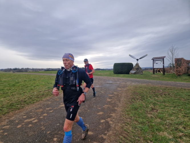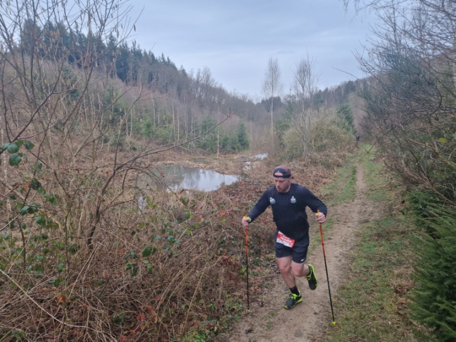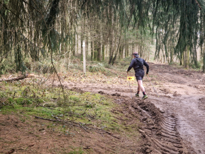 Die dritte Schleife biete die breitesten Wege und viele flache Stellen, an denen sich auch schon einmal das Wasser gesammelt hat. Aber alles gut zu umlaufen, so dass es diesmal keine Matschorgie gab, wie so oft über den Winter auf ähnlichen Strecken. Beim zweiten Verpflegungsstopp, also auf 2/3 er Strecke, kommen mit mir gleichzeitig die ersten 44-km-Läufer ins Ziel und starten die 26-km-Läufer. Von denen kommen dann wiederum die ersten ins Ziel als ich fertig bin.