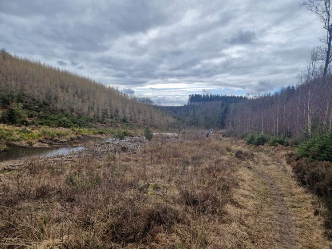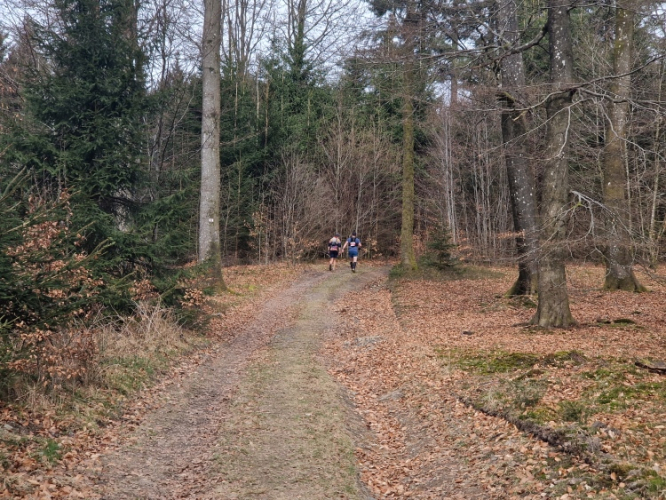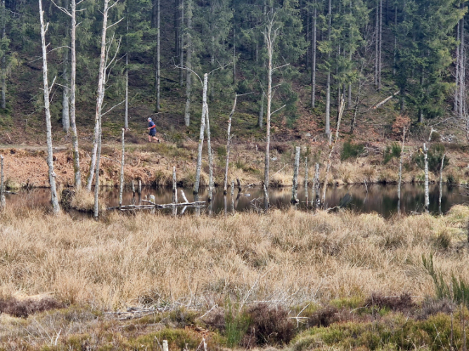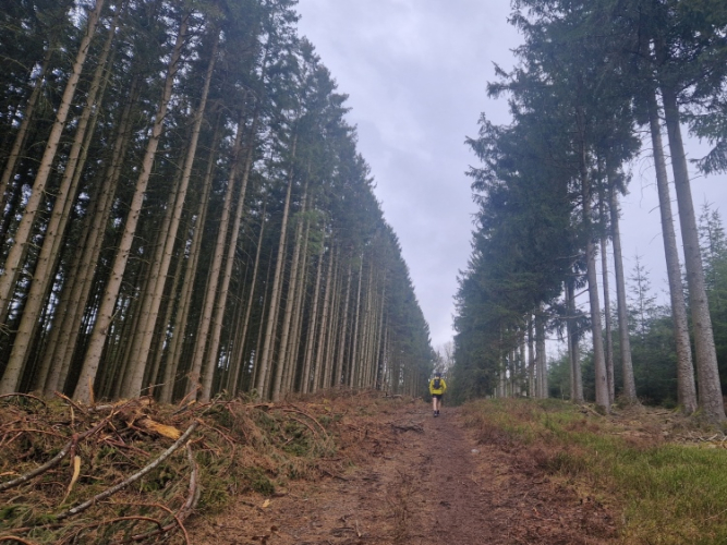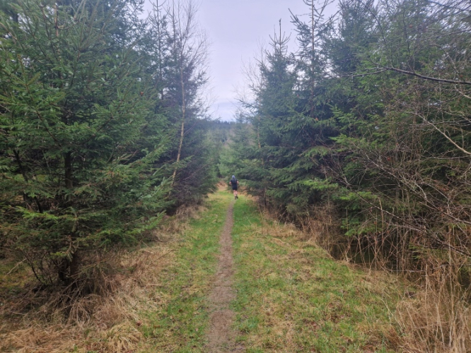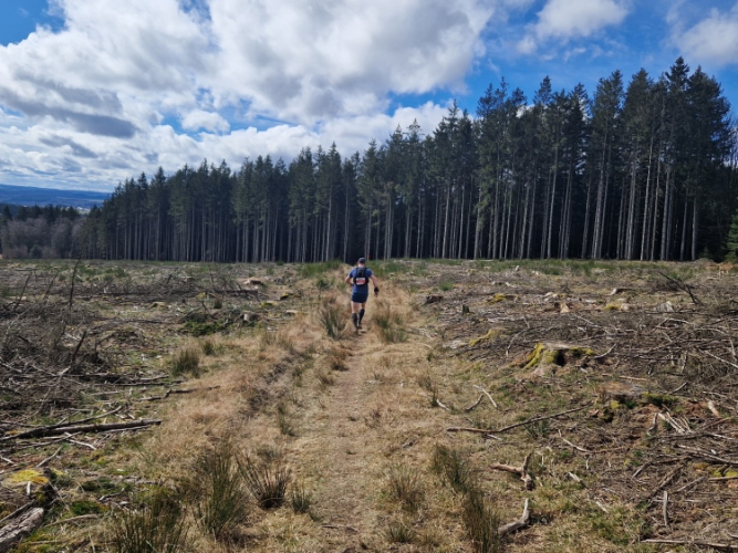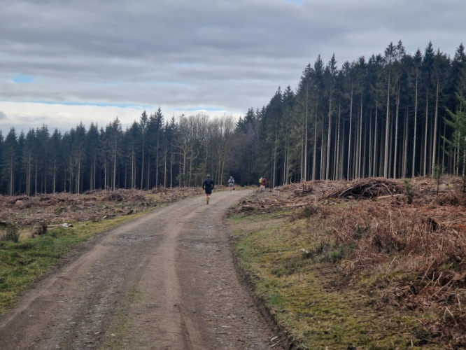 Die zweite Schleife findet dann großenteils auf schmalen Wald- und Forstwegen statt und ist deutlich flacher, so dass man wirklich gut ans Laufen kommt. Die Hügel sind teilweise gerodet, evtl. wegen Sturmschäden. Nicht nur hier, sondern auch im Bestand findet man mehr in gerade Linien gepflanzte Baumreihen als man denken sollte. Es ist dann doch nicht alles komplett naturbelassen, aber Natur.
