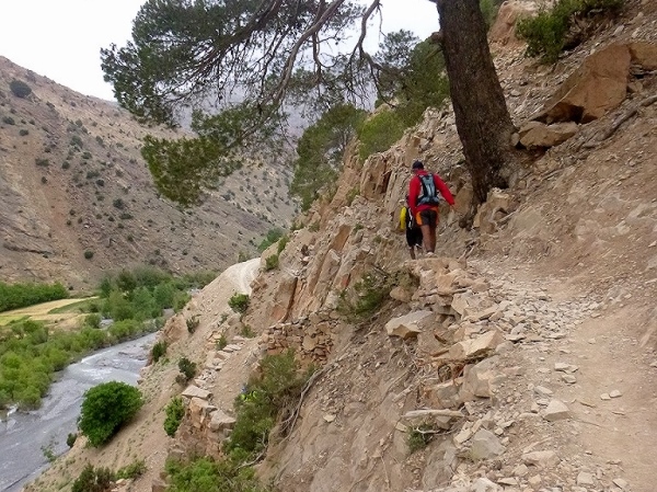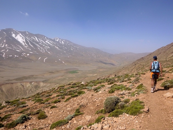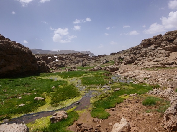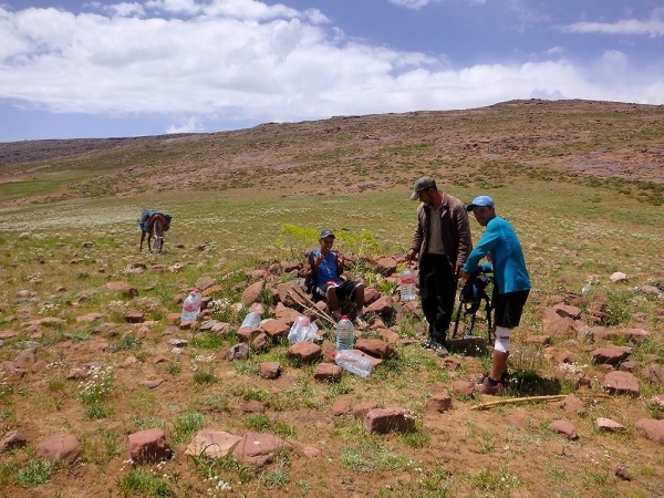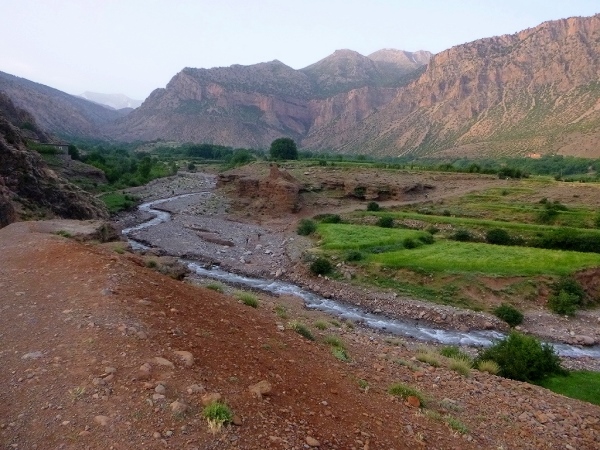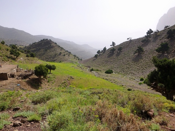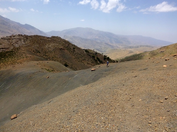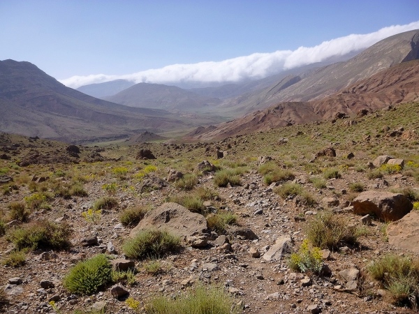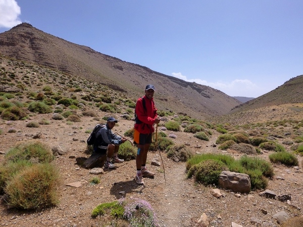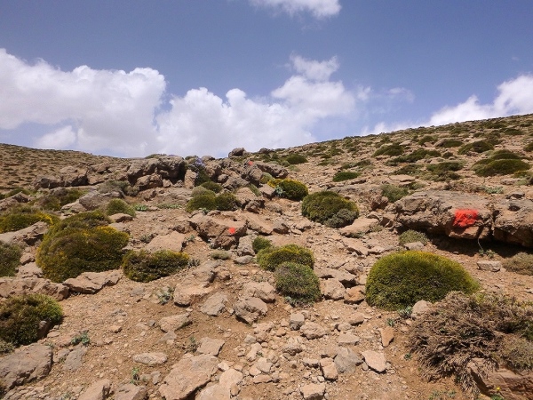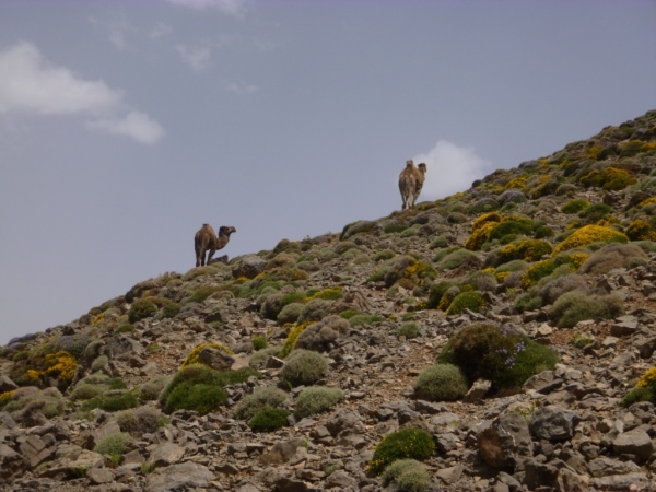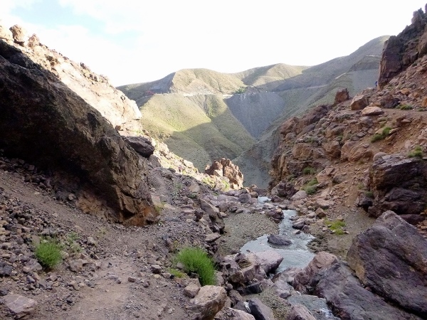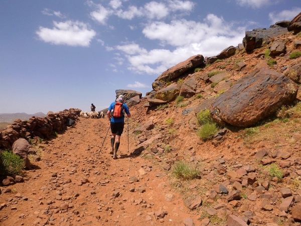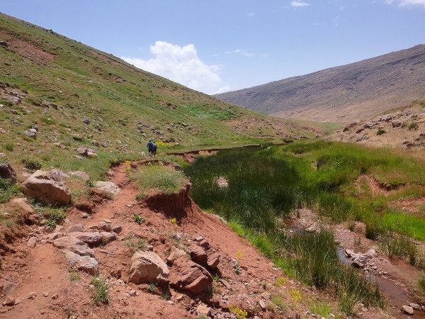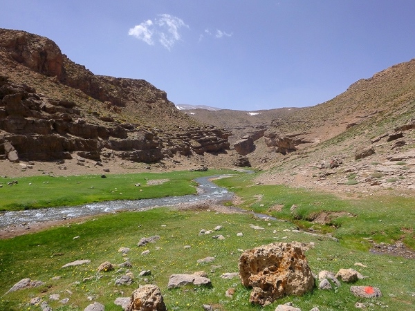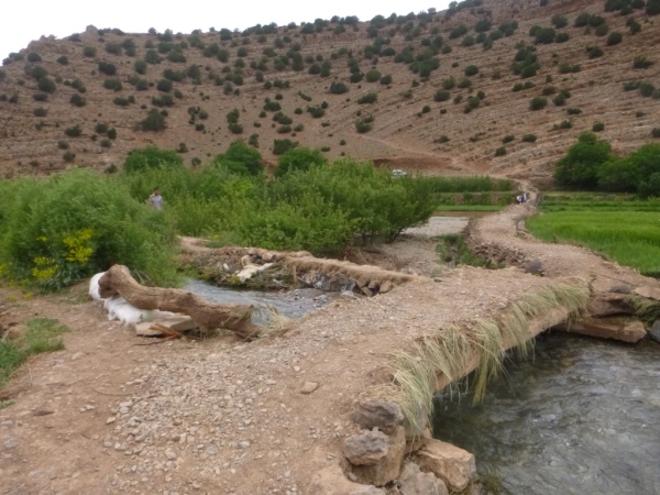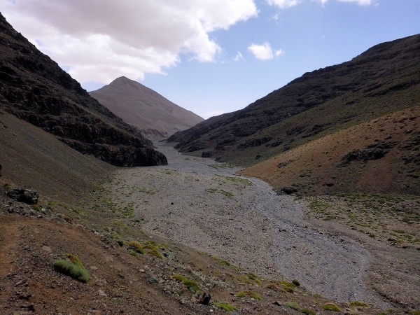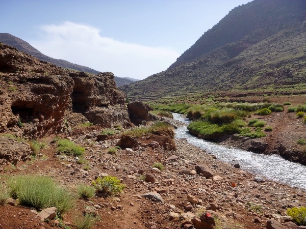 Beeindruckend war auch für mich die Weite, die ich überblicken konnte, wenn ich einen Berg überschritt und sich ein Hochtal vor mir ausbreitete, wenn ich in der Ferne das saftige Grün sah und mich selbst in der kargen Bergwüste befand. So hatte ich Kilometer für Kilometer immer wieder neue Eindrücke. Zuweilen hatte ich auch nette Begleitung, doch war es mir nicht immer möglich, mit den leichtfüßigen Marokkanern mitzuhalten. Zum anderen wollte ich aber auch verletzungsfrei die 6 Tage überstehen und das war in diesem Gelände nicht immer ganz einfach. Nicht nur die steinigen Bergwege, falls überhaupt ein Weg da war, stellten eine besondere Herausforderung dar, sondern auch die langen Abschnitte in dem losen Schotter eines ausgetrockneten Bachbettes oder die ständigen Wechsel der Bachseite über die Felsen oder einfach durchs Wasser.