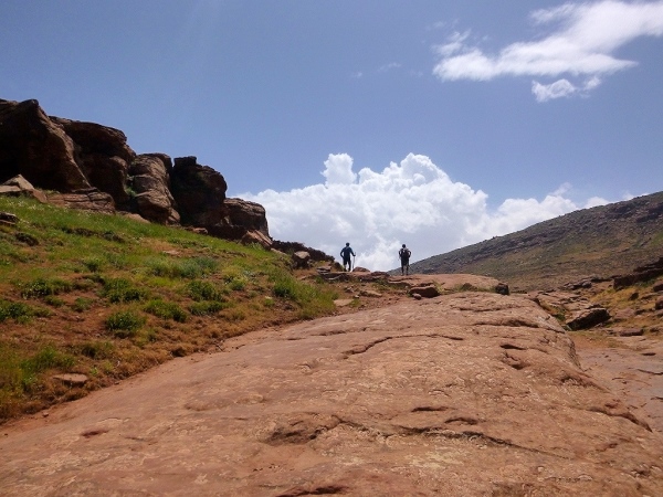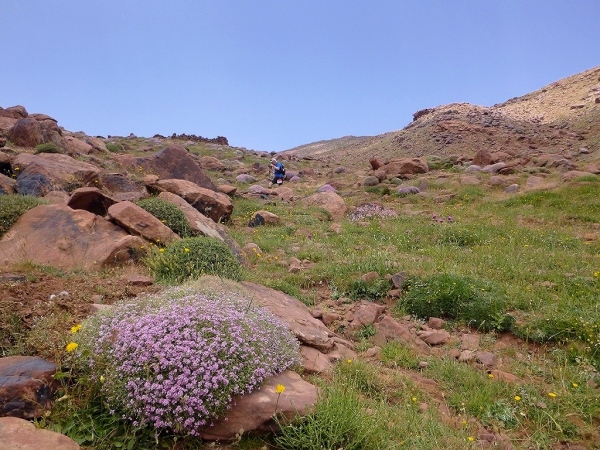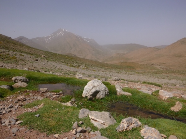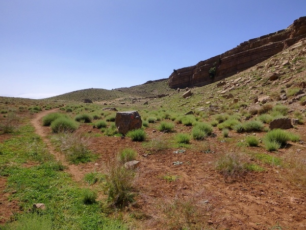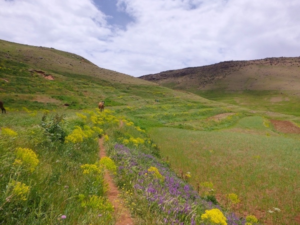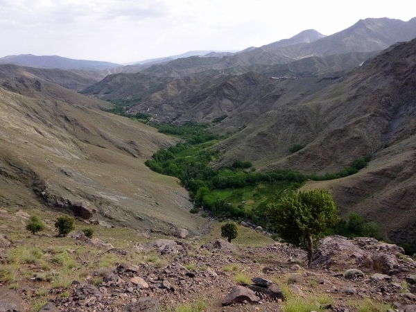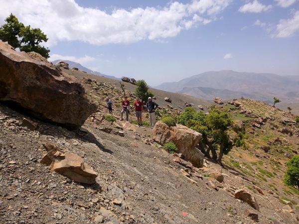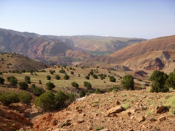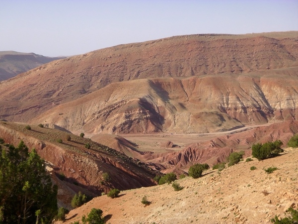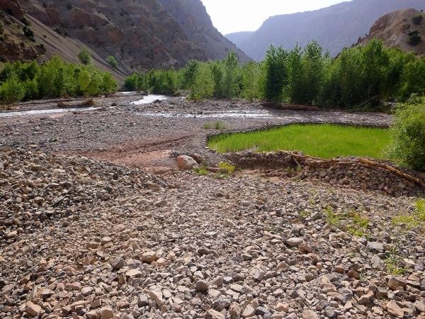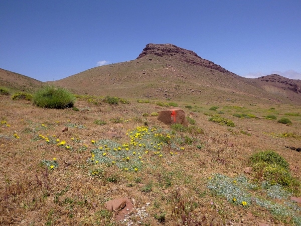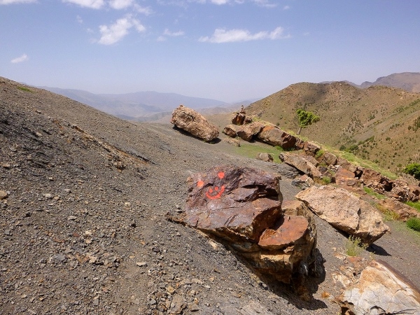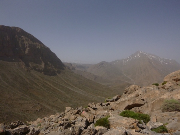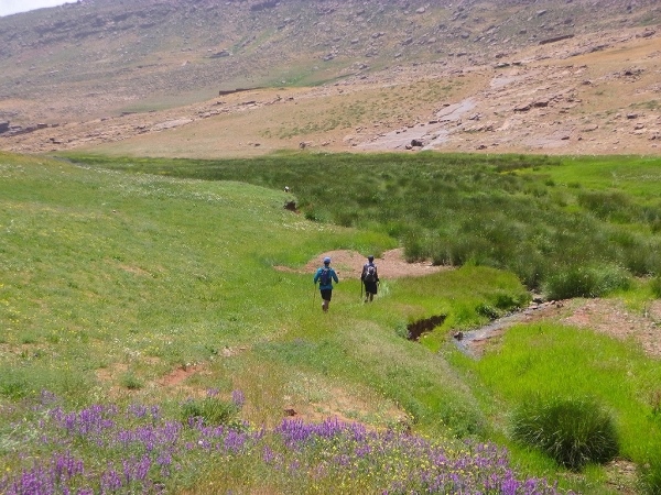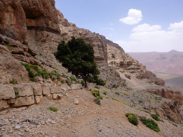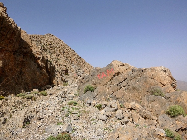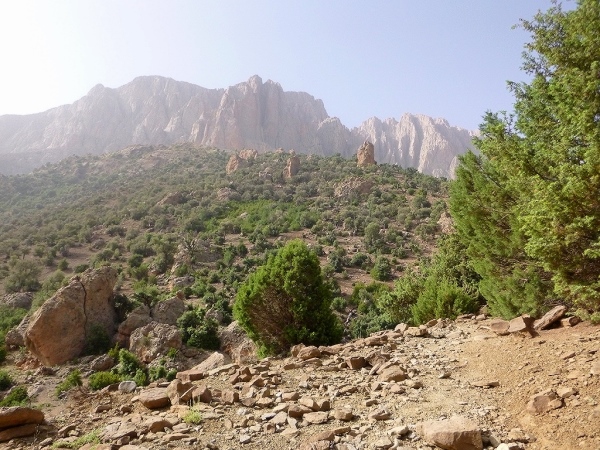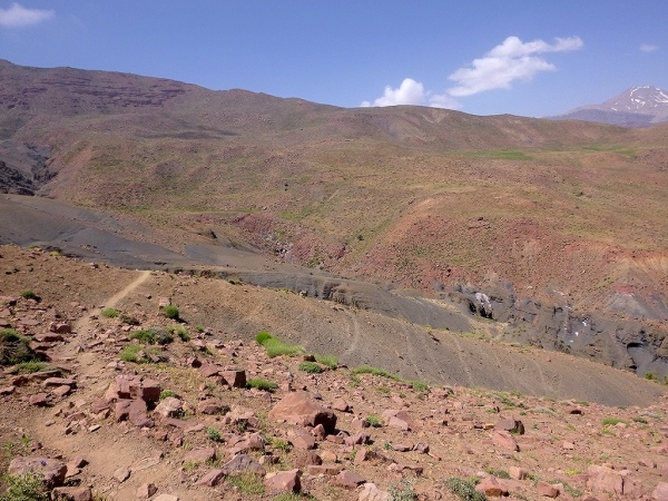 Beeindruckend war auch für mich die Weite, die ich überblicken konnte, wenn ich einen Berg überschritt und sich ein Hochtal vor mir ausbreitete, wenn ich in der Ferne das saftige Grün sah und mich selbst in der kargen Bergwüste befand. So hatte ich Kilometer für Kilometer immer wieder neue Eindrücke. Zuweilen hatte ich auch nette Begleitung, doch war es mir nicht immer möglich, mit den leichtfüßigen Marokkanern mitzuhalten. Zum anderen wollte ich aber auch verletzungsfrei die 6 Tage überstehen und das war in diesem Gelände nicht immer ganz einfach. Nicht nur die steinigen Bergwege, falls überhaupt ein Weg da war, stellten eine besondere Herausforderung dar, sondern auch die langen Abschnitte in dem losen Schotter eines ausgetrockneten Bachbettes oder die ständigen Wechsel der Bachseite über die Felsen oder einfach durchs Wasser.