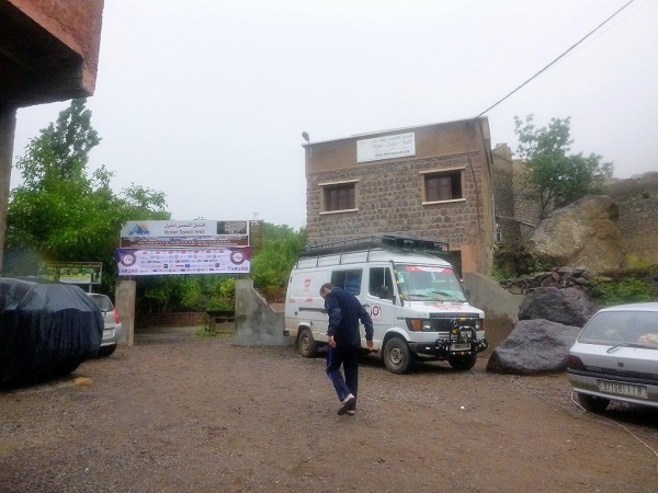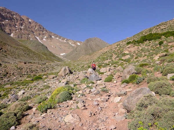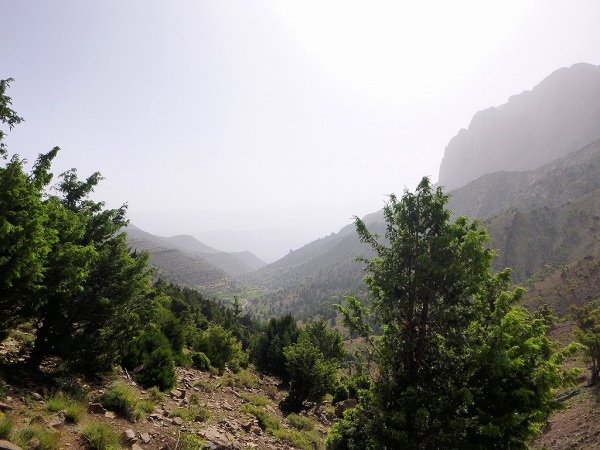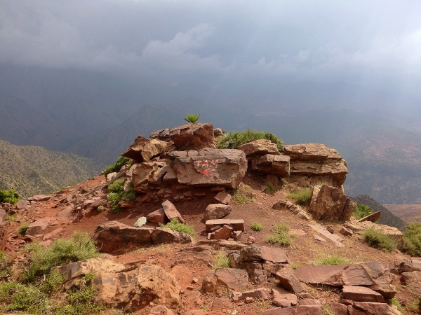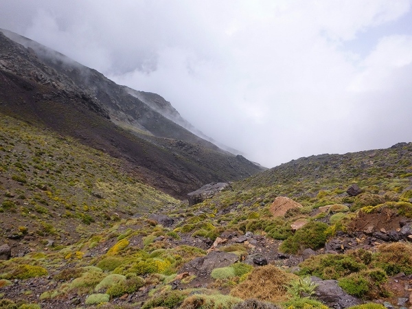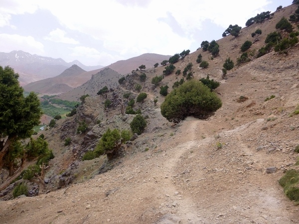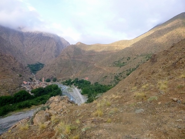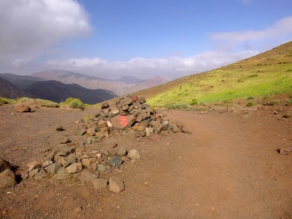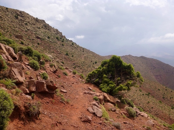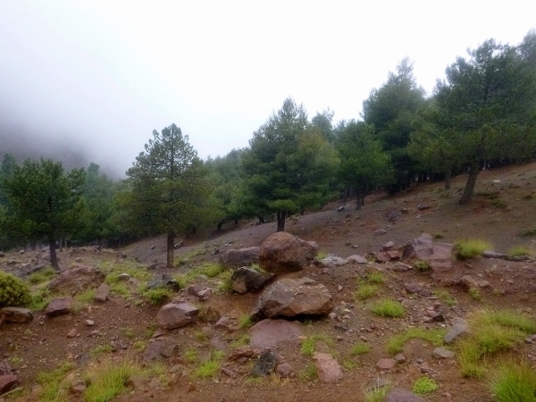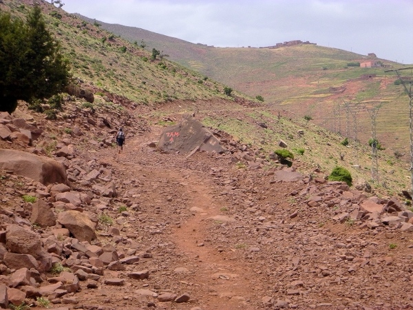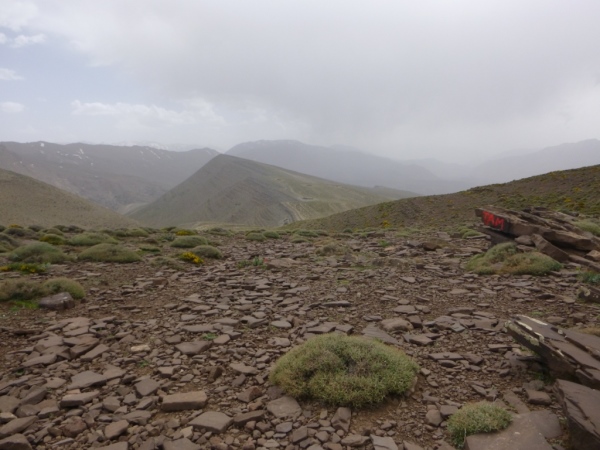 Irgendwie traurig und doch froh, es so weit geschafft zu haben, ging ich auf die letzte Etappe. Noch etwa 40 Kilometer lagen vor mir bis zum heutigen Ziel in Imlil. Noch einmal musste ich mich auf den 3180 m hohen Tizi Tibbasan „in eisige Höhen“ begeben. Kurz unterhalb des Gipfels zogen dunkle Wolken herein und brachten nicht nur einen kalten Wind mit, sondern auch Regen mit Hagelkörner, die sich wie Nadeln auf den nackten Oberschenkeln anfühlten. Leider war keine Wetteränderung in Sicht, auch nicht auf der anderen Bergseite. Der Regen wollte nun gar nicht mehr aufhören, wurde sogar noch heftiger, als ich talwärts lief. Ein Gegenanstieg von 2,3 km und 400 Höhenmeter auf den 2303 m hohen Tizi n´Tamatert brachte meine Oberschenkel noch ein letztes Mal zum Glühen. Durch weitläufige Kiefernwälder ging es dann hinunter nach Imlil, später auf der Hauptstraße mitten durch diesen Touristenort. Der Regen hatte nachgelassen, aber es war kalt geworden und ich war froh, dass ich mich im Hotel unter einer warmen Dusche aufwärmen konnte. Diese Bedingungen erinnerten mich stark an meine Alpenquerungen!