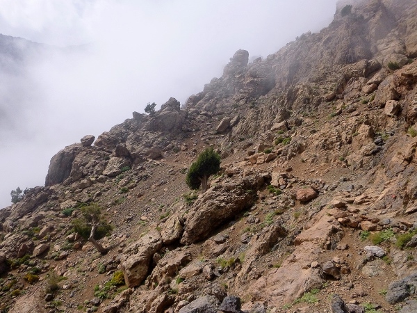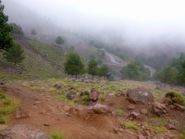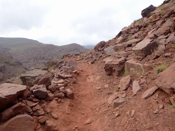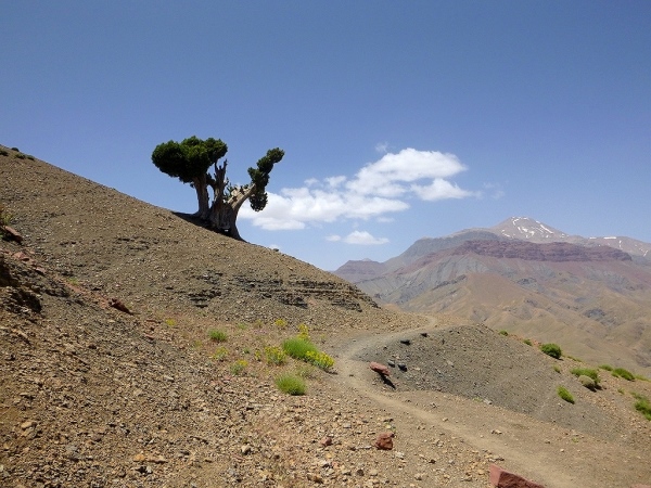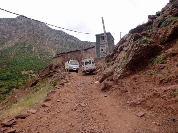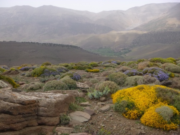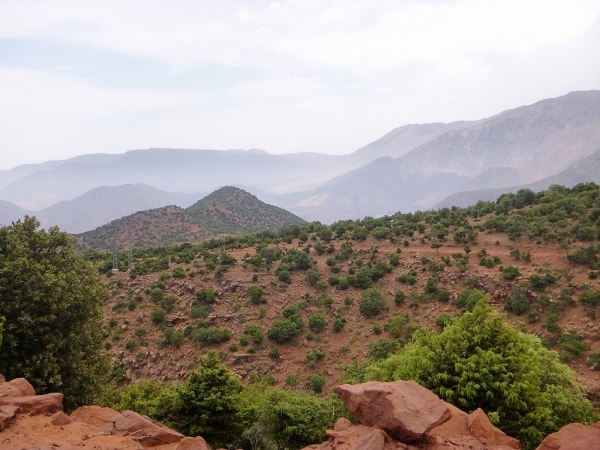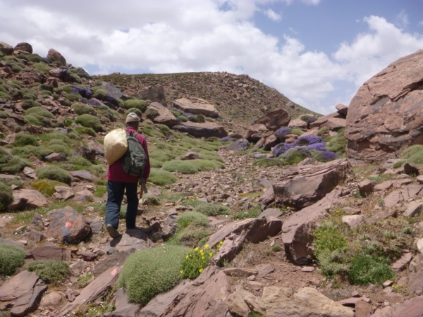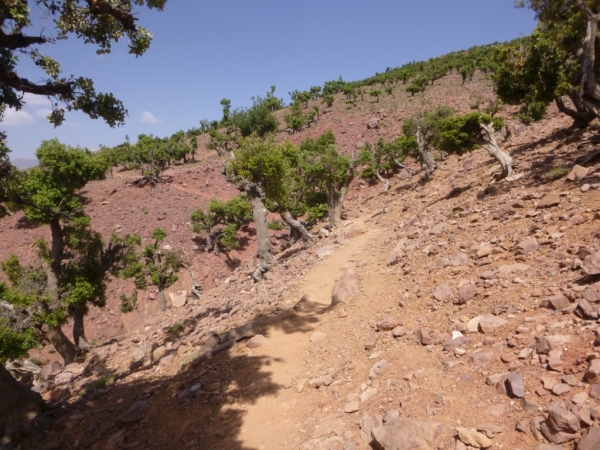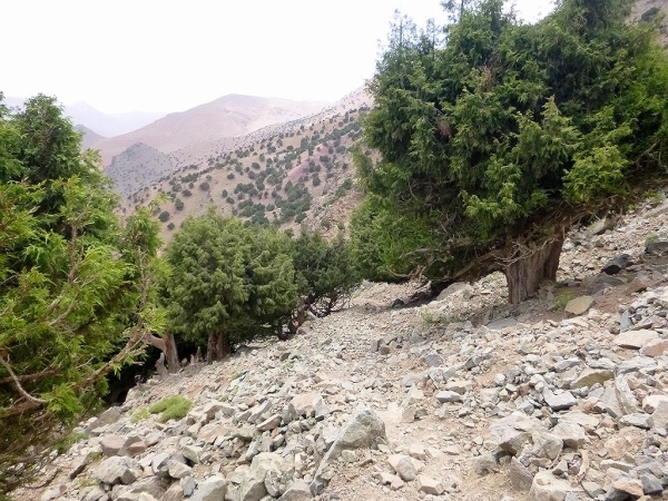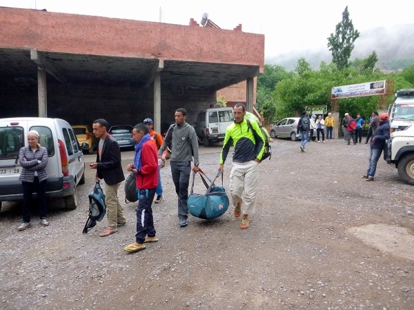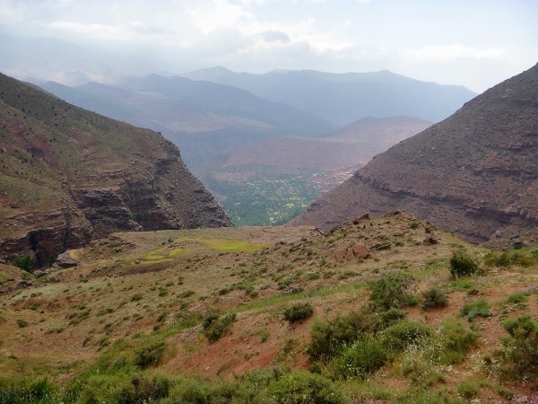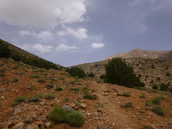 Irgendwie traurig und doch froh, es so weit geschafft zu haben, ging ich auf die letzte Etappe. Noch etwa 40 Kilometer lagen vor mir bis zum heutigen Ziel in Imlil. Noch einmal musste ich mich auf den 3180 m hohen Tizi Tibbasan „in eisige Höhen“ begeben. Kurz unterhalb des Gipfels zogen dunkle Wolken herein und brachten nicht nur einen kalten Wind mit, sondern auch Regen mit Hagelkörner, die sich wie Nadeln auf den nackten Oberschenkeln anfühlten. Leider war keine Wetteränderung in Sicht, auch nicht auf der anderen Bergseite. Der Regen wollte nun gar nicht mehr aufhören, wurde sogar noch heftiger, als ich talwärts lief. Ein Gegenanstieg von 2,3 km und 400 Höhenmeter auf den 2303 m hohen Tizi n´Tamatert brachte meine Oberschenkel noch ein letztes Mal zum Glühen. Durch weitläufige Kiefernwälder ging es dann hinunter nach Imlil, später auf der Hauptstraße mitten durch diesen Touristenort. Der Regen hatte nachgelassen, aber es war kalt geworden und ich war froh, dass ich mich im Hotel unter einer warmen Dusche aufwärmen konnte. Diese Bedingungen erinnerten mich stark an meine Alpenquerungen!