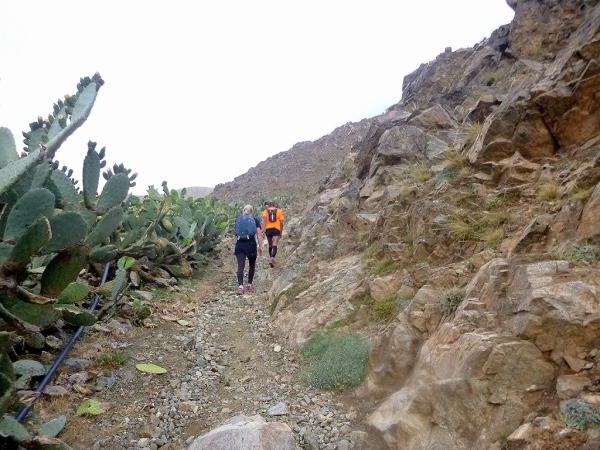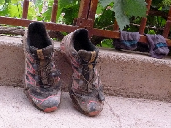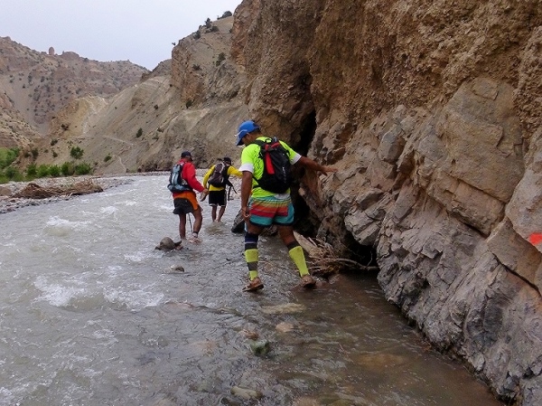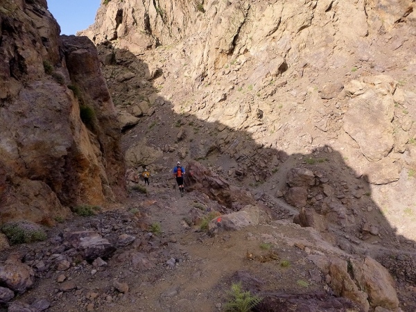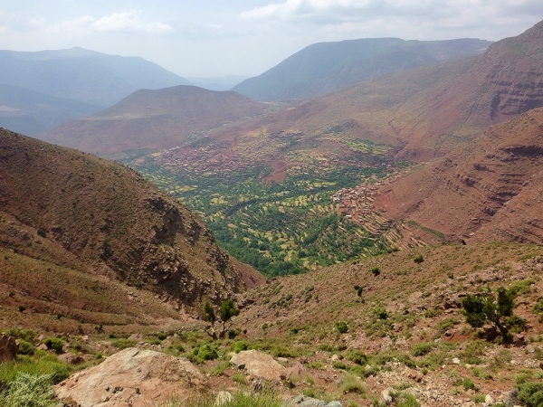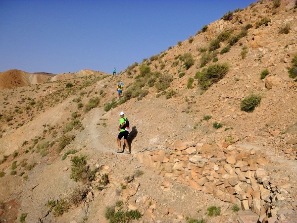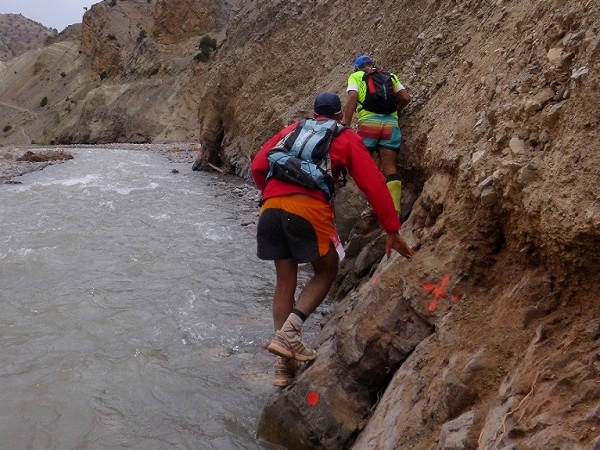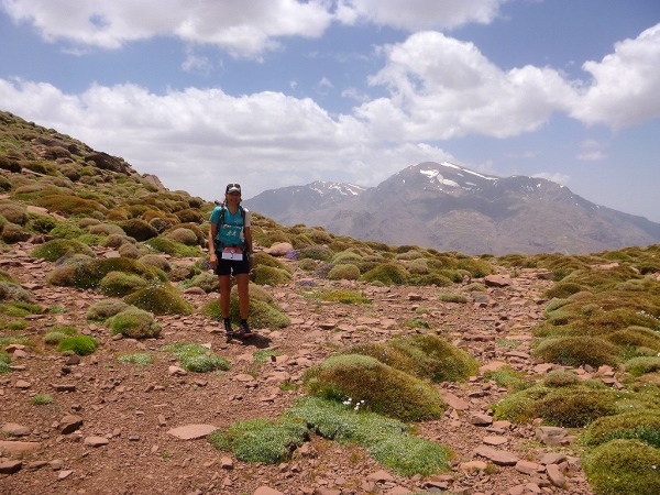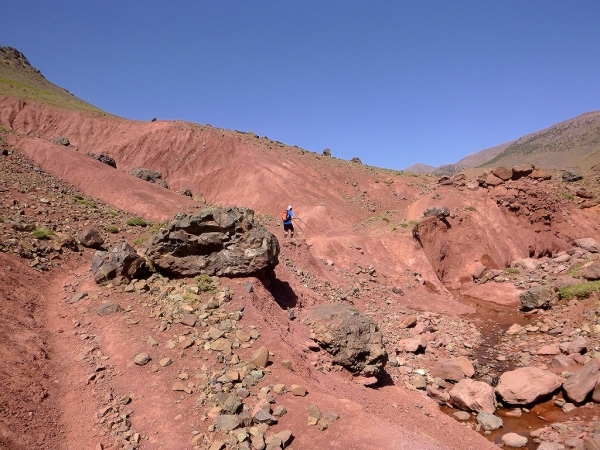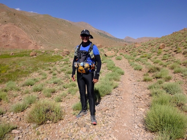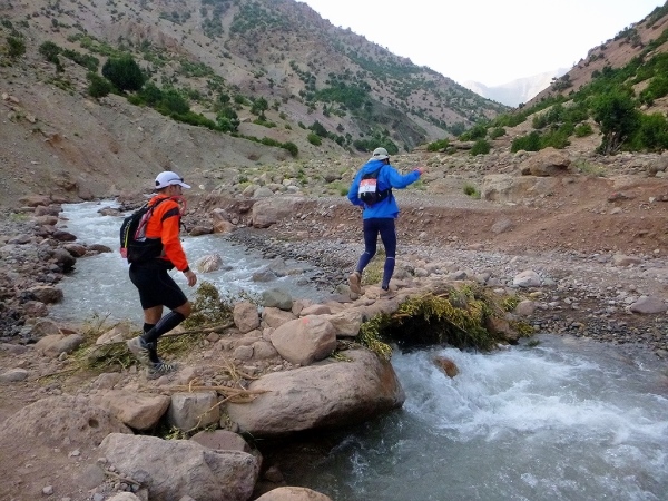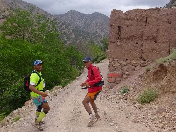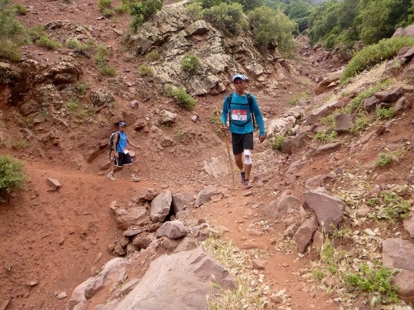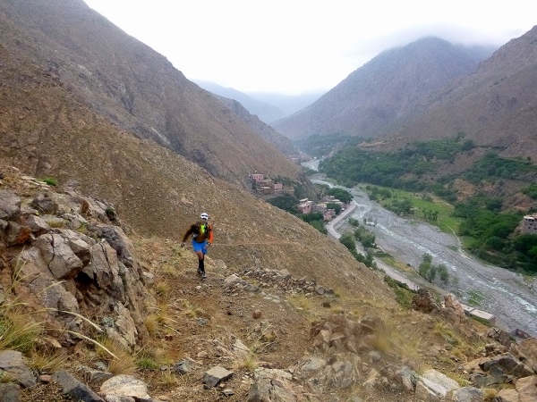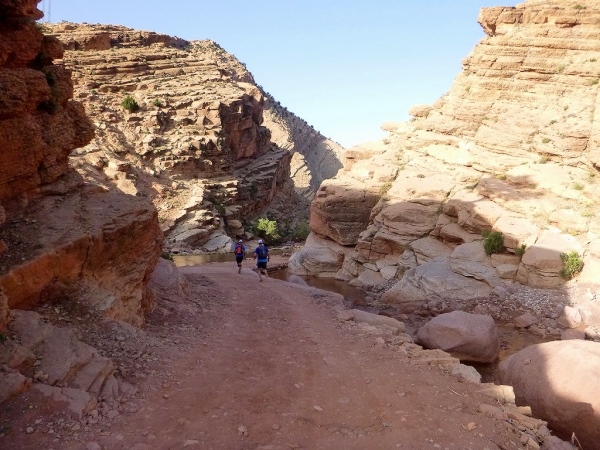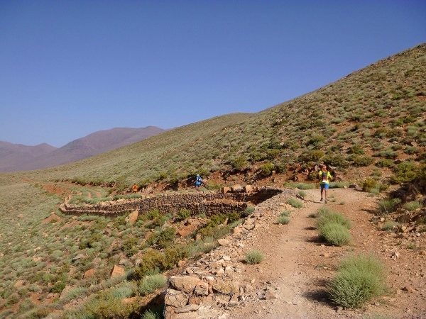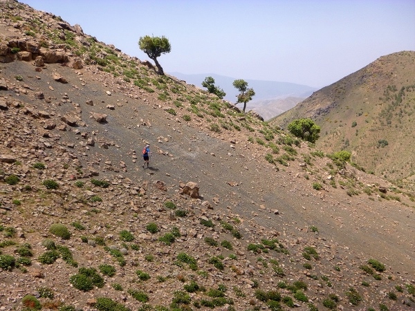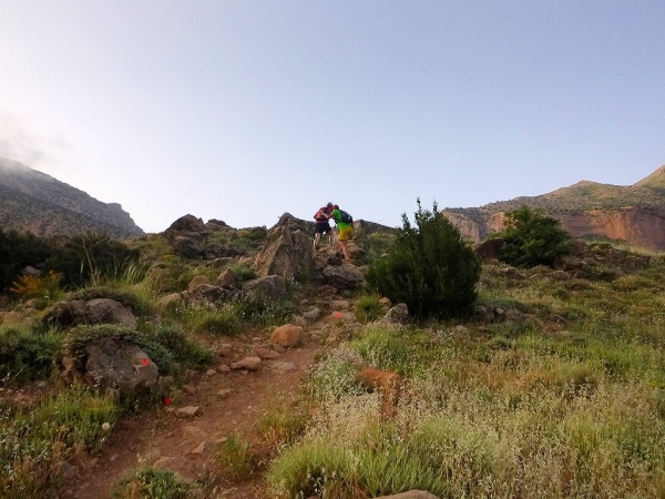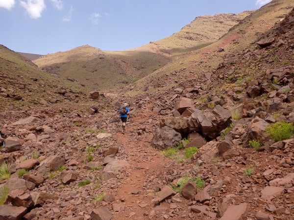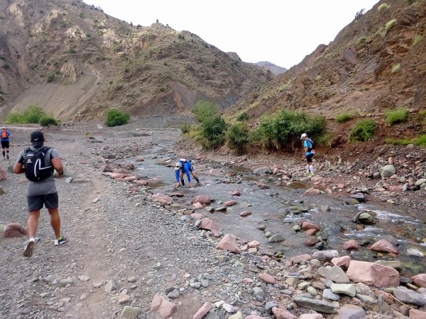 Unsere vorletzte Etappe bestand im Wesentlichen aus extrem langen Auf- und Abstiegen. So konnten wir uns auf 17 Kilometer talwärts austoben, wenn die engen Trails es zuließen. Immer wieder bremsten mich steile, steinige Zickzacktrails aus. Und als ich dann noch im Gebirgsbach ungewollt baden ging, hatte ich erst einmal genug vom vielen Bergab. Zum Glück hatte ich mir nur eine Prellung am Schienbein zugezogen und konnte ungehindert weiterlaufen! Ich hatte ja noch viele Kilometer vor mir. Auch wenn die absolute Höhe auf dem Tizi n´Ghlis bei nur 2333 m lag, hatte ich einige Höhenmeter dazwischen zu bewältigen, unser niedrigster Punkt heute lag in Azgour bei 1335 m.