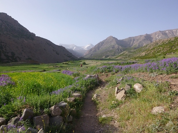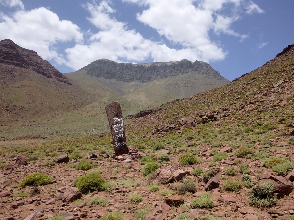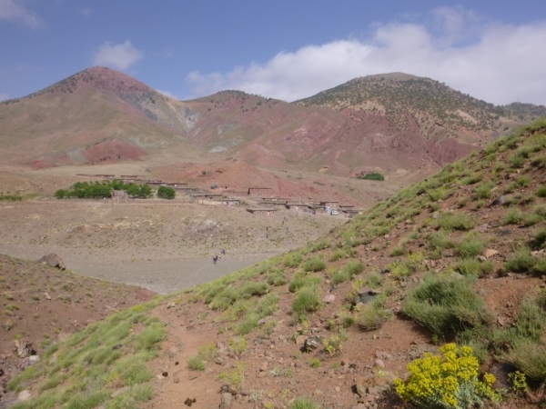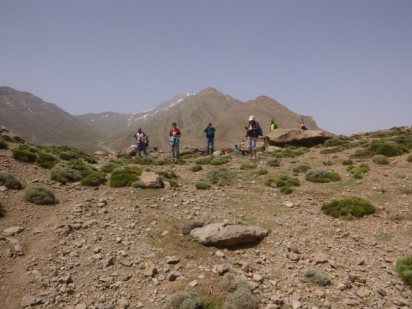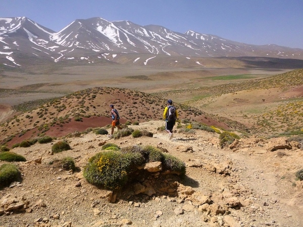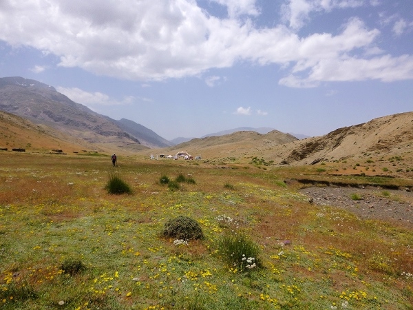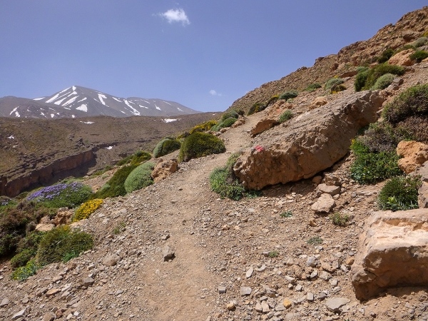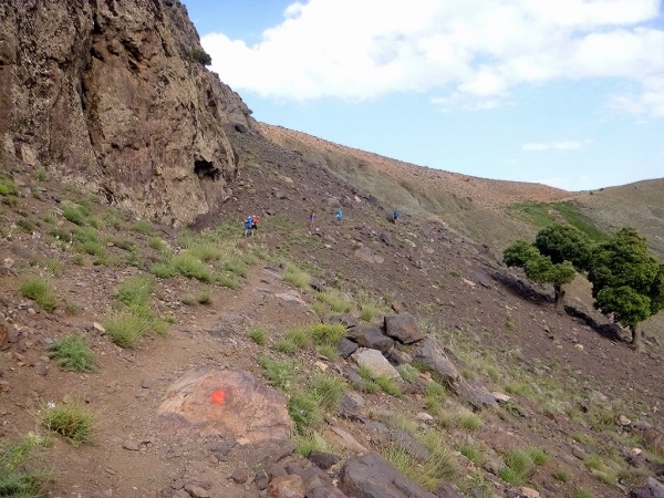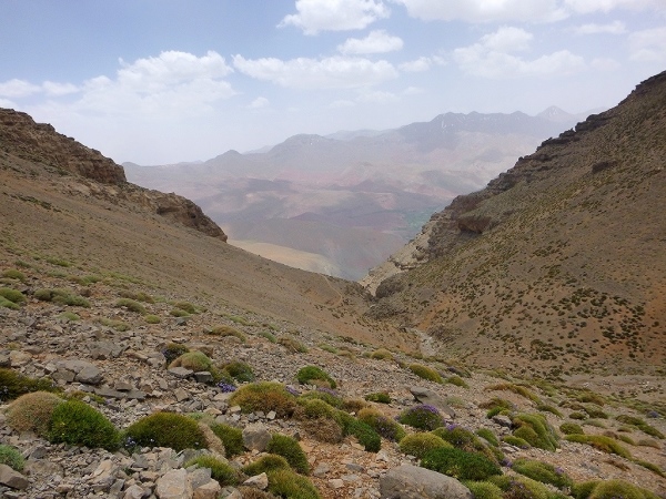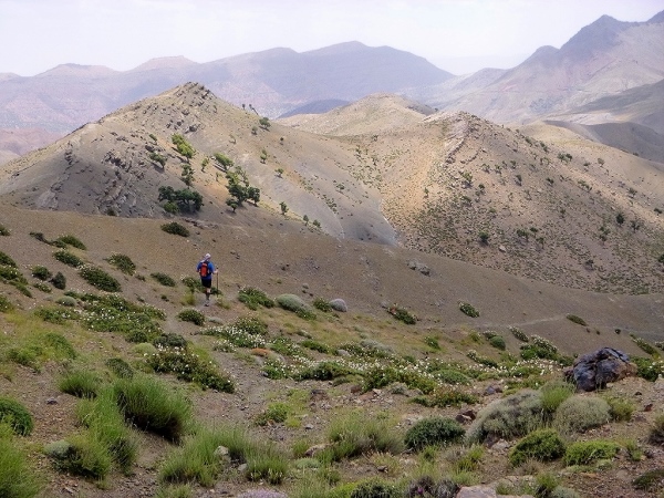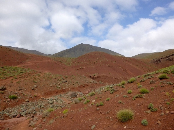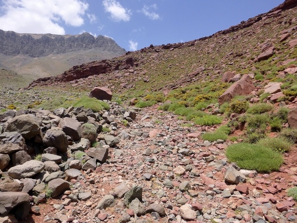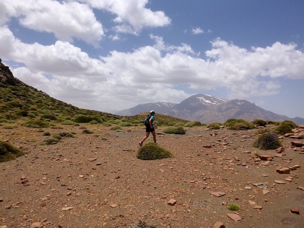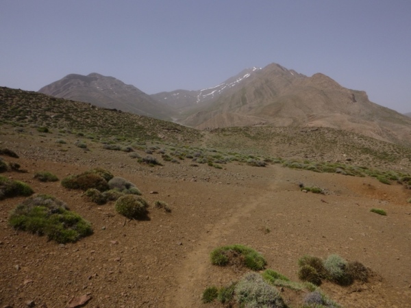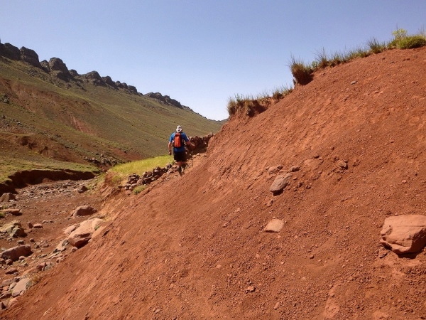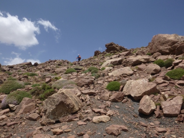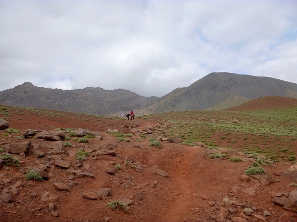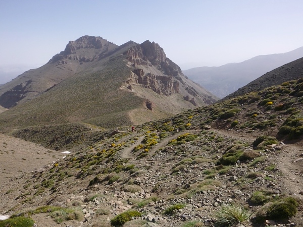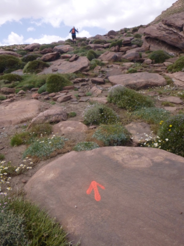 Eine kurze Etappe von Tighza nach Tizi N´Tichka stand am vierten Tag auf dem Programm, nur 31 Kilometer und etwa 1500 Höhenmeter im Aufstieg. Aber auch diese Strecke hatte es mit drei Bergen in sich, der heutige höchste Punkt bei km 28 lag auf 2680 m, nicht allzu hoch. Ein kurzer Gegenanstieg trennte mich nun noch vor dem drei Kilometer langen und 450 m steilen Abstieg zum Biwak Tichka (2092 m). Schon von weitem konnte ich das Biwak im Tal auf der Wiese erkennen und die laute Musik hören. Schnell hinunter in steilen engen Zickzack-Kurven, oder einfach geradeaus ging es dem nächsten Etappenziel entgegen.
