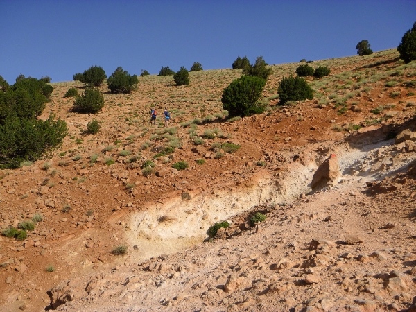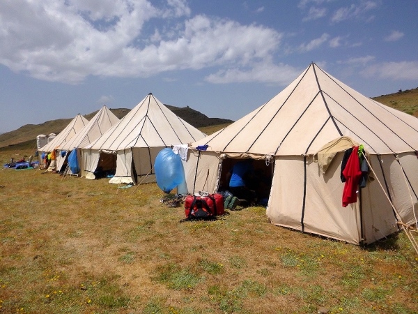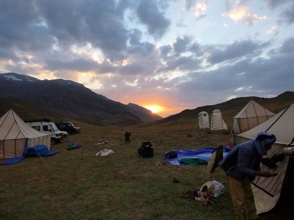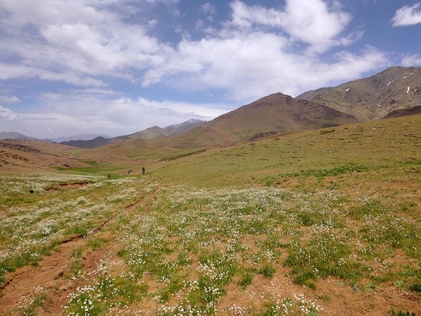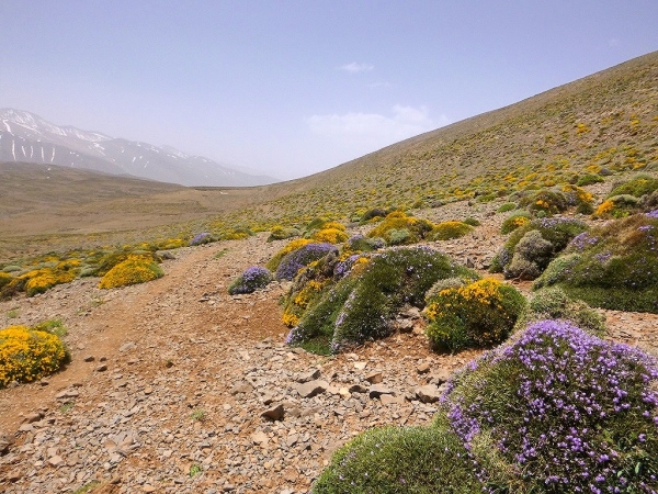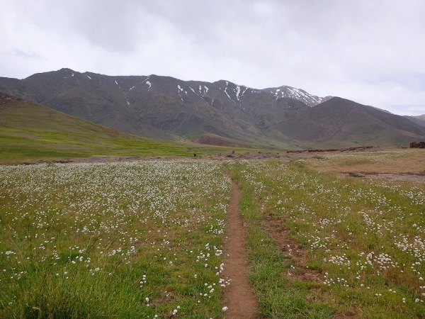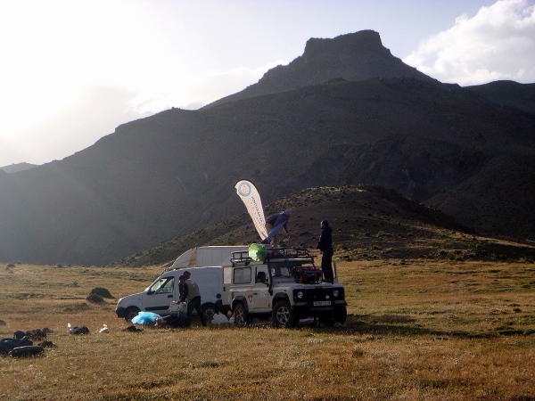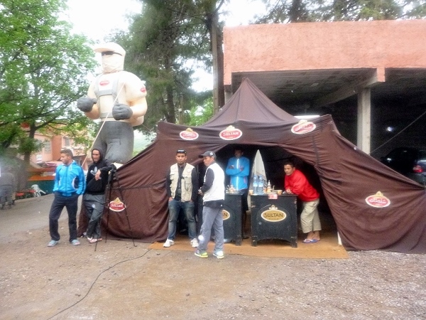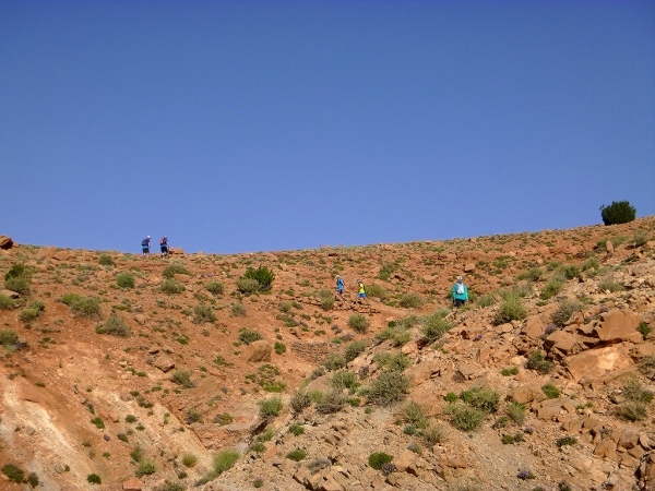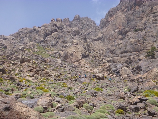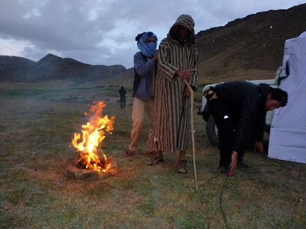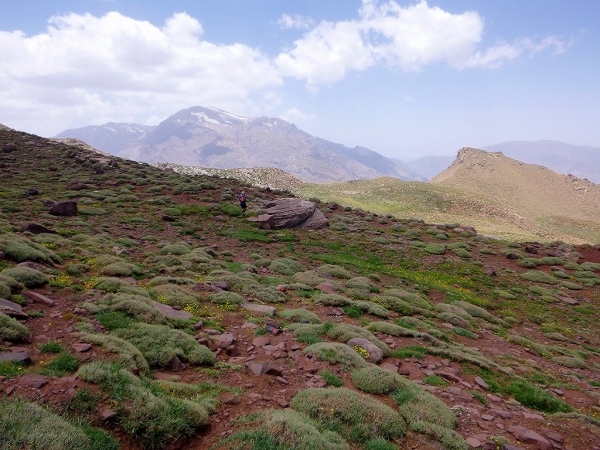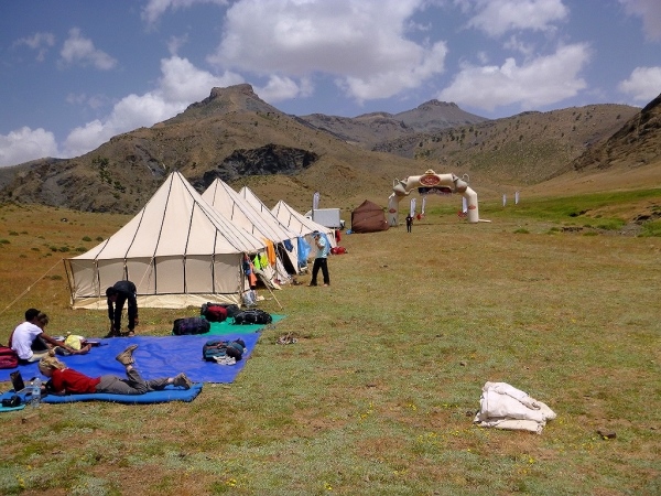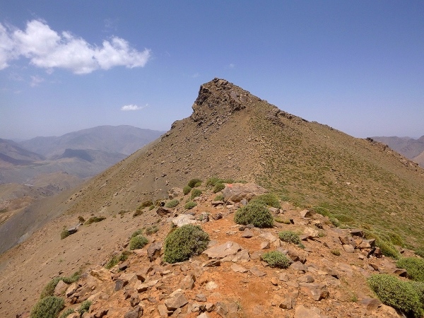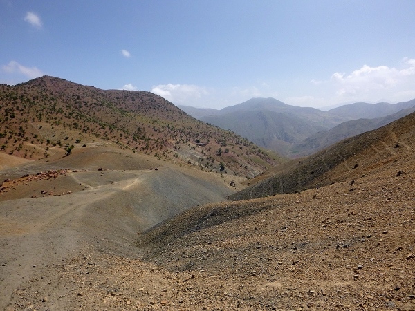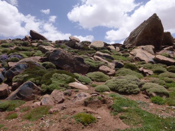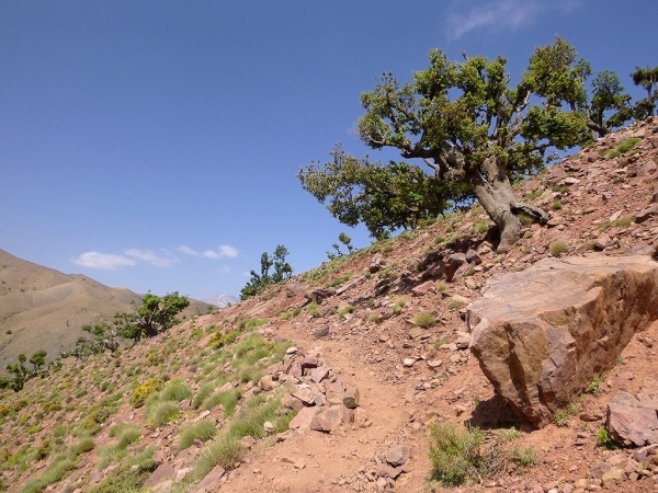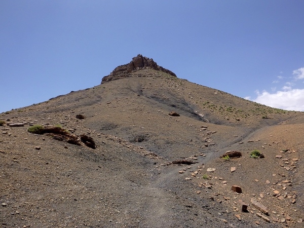 Eine kurze Etappe von Tighza nach Tizi N´Tichka stand am vierten Tag auf dem Programm, nur 31 Kilometer und etwa 1500 Höhenmeter im Aufstieg. Aber auch diese Strecke hatte es mit drei Bergen in sich, der heutige höchste Punkt bei km 28 lag auf 2680 m, nicht allzu hoch. Ein kurzer Gegenanstieg trennte mich nun noch vor dem drei Kilometer langen und 450 m steilen Abstieg zum Biwak Tichka (2092 m). Schon von weitem konnte ich das Biwak im Tal auf der Wiese erkennen und die laute Musik hören. Schnell hinunter in steilen engen Zickzack-Kurven, oder einfach geradeaus ging es dem nächsten Etappenziel entgegen.