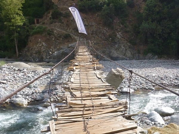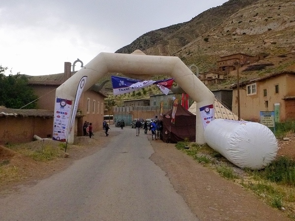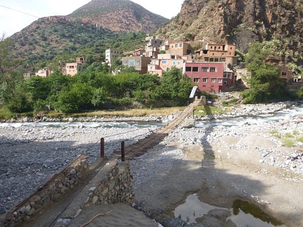 Zum Abschluss der heutigen Etappe sollte es auf einem wunderschönen Trail und über einen Grat ins Tal gehen. Leider musste ich einem Gewitter weichen, wäre aber zu gern etwas länger hier oben geblieben, um die Aussicht auf das weitläufige Tal genießen zu können. Eine wackelige Angelegenheit mit Blick auf tosendes Gewässer war eine Hängebrücke über den reißenden Gebirgsbach. Noch ein kurzer, steiler Anstieg hinauf auf die Asphaltstraße und schon war ich im Ziel in Imi n´Taddert (1361 m). Direkt neben unserem Hotel befanden sich der Zielbogen und das Zelt, in dem wir später essen würden. Und ein kleiner Lebensmittelladen, wie ich ihn schon seit Tagen nicht mehr gesehen hatte. Da musste ich nach dem Duschen mal vorbei schauen und mir etwas Leckeres kaufen.