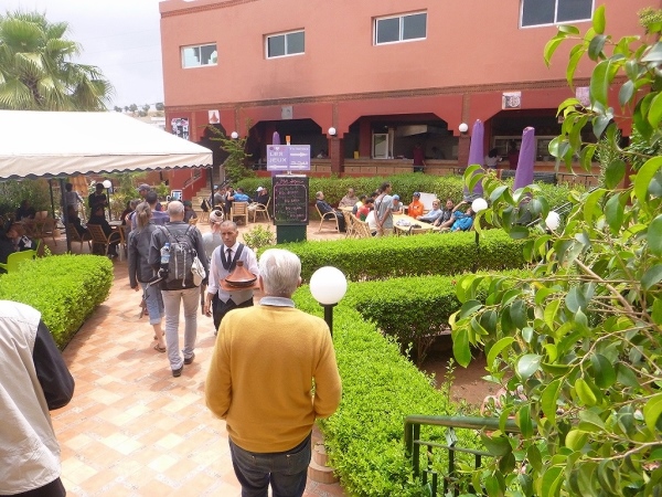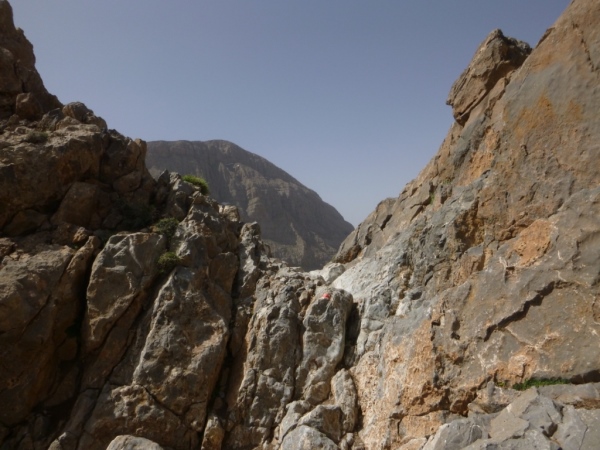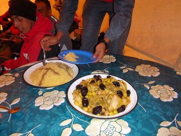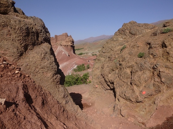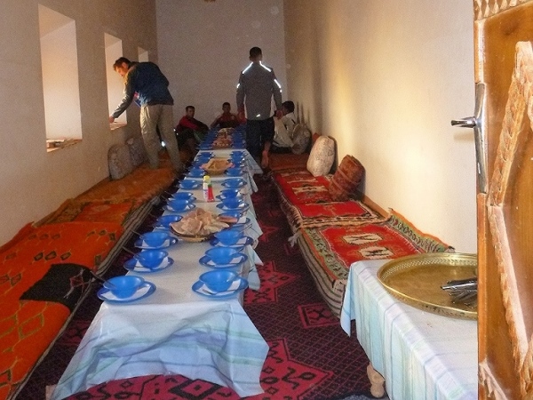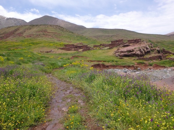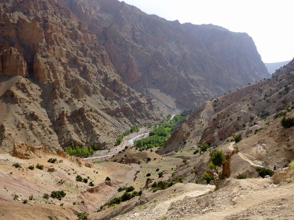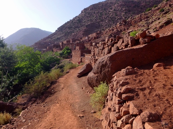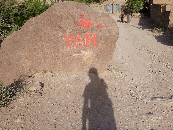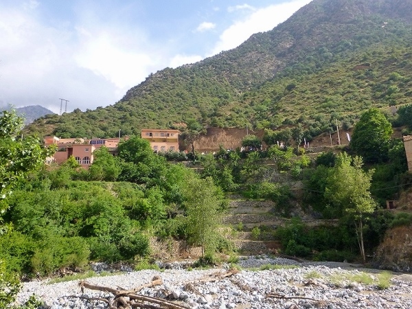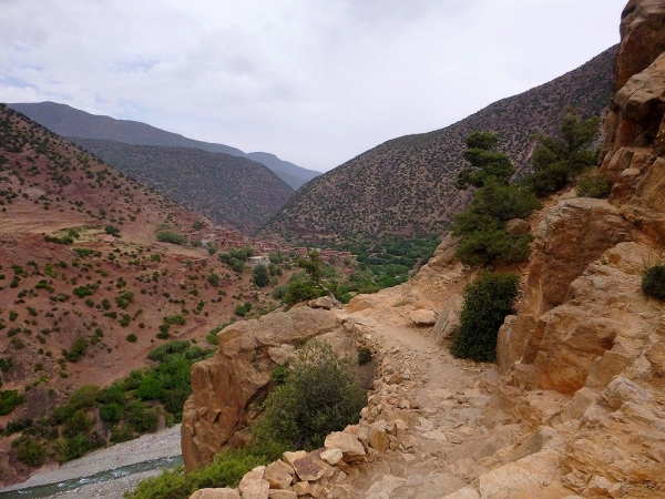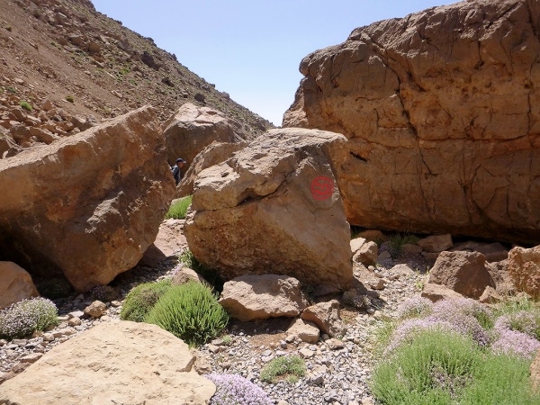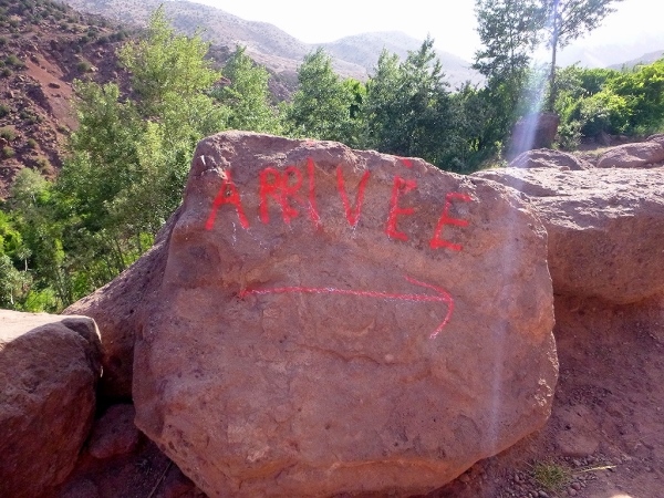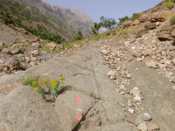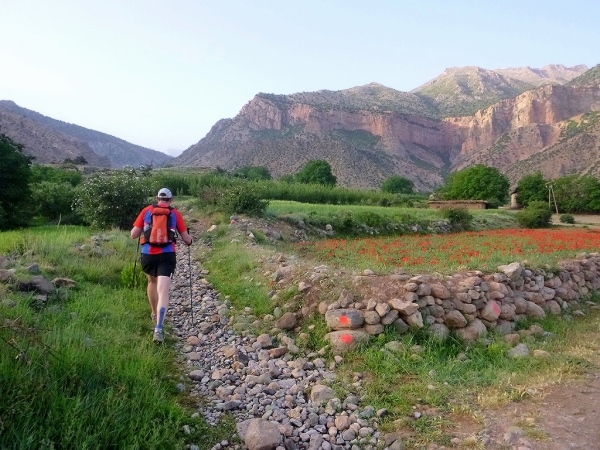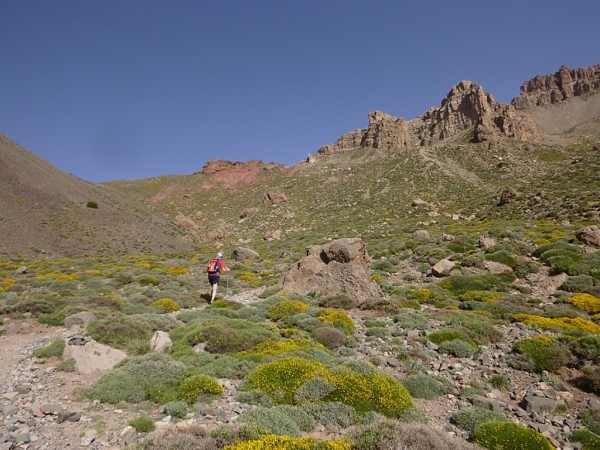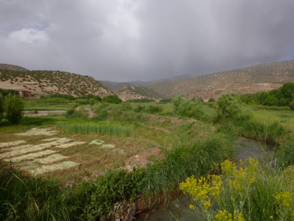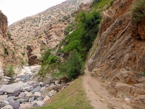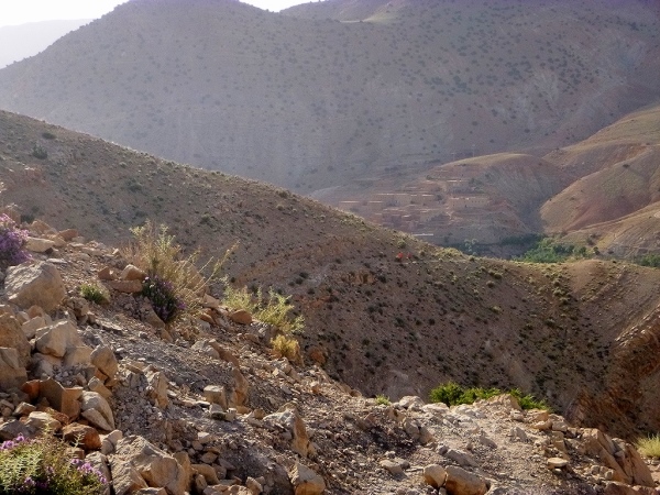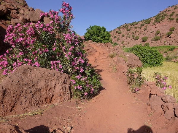 Als ich unten im Tal ankam, verpasste ich die Streckenmarkierung und folgte einem kleinen Pfad flussabwärts, leider auf der falschen Bachseite. So musste ich dann eine geeignete Stelle suchen, um den reißenden Gebirgsbach über große Felsen springend zu queren. Die letzten Kilometer bis zum heutigen Ziel führten dann auf einem schmalen Felsenweg durch blühende Oleandersträucher – ein wahres Paradies! In Tighza übernachteten wir wieder in einer Gite d´Etape, wo uns das Kochteam wie jeden Abend mit typisch marokkanischen Essen verwöhnte.