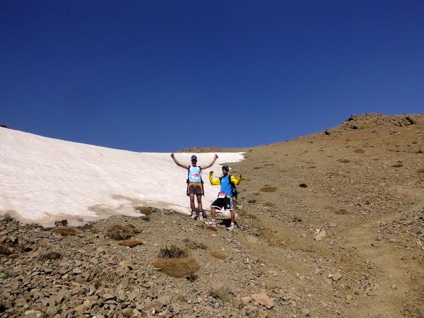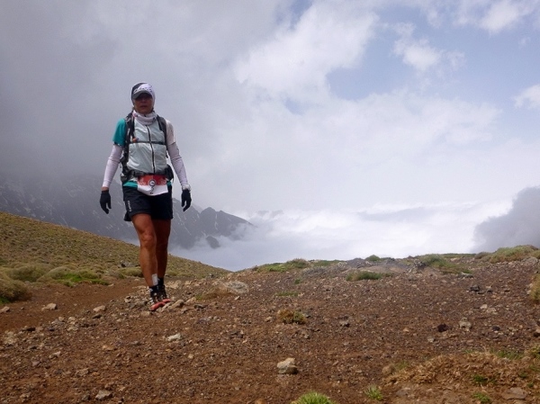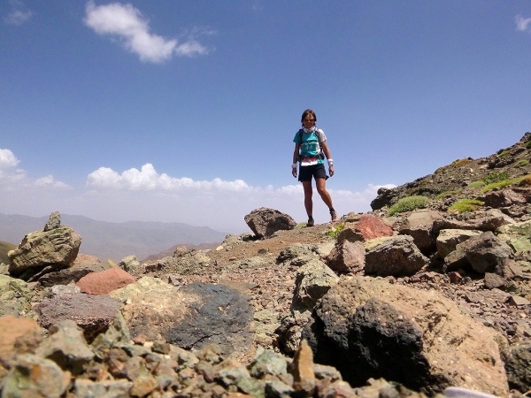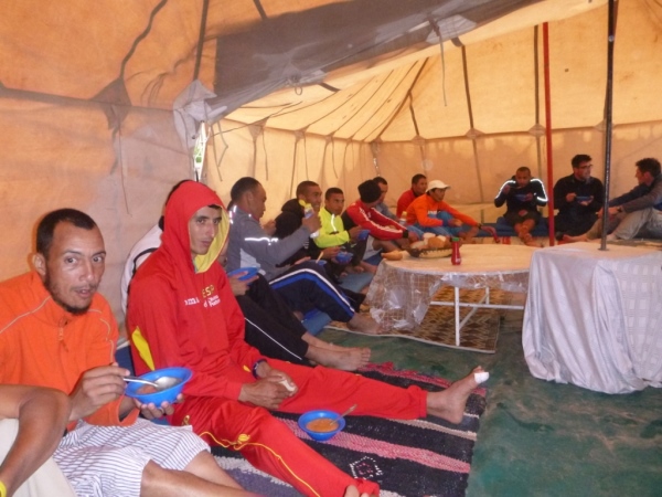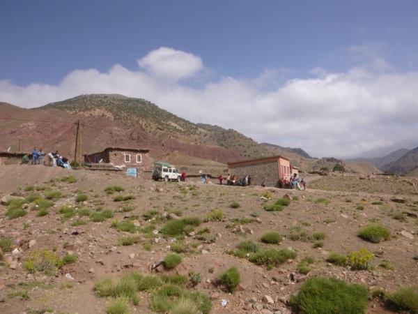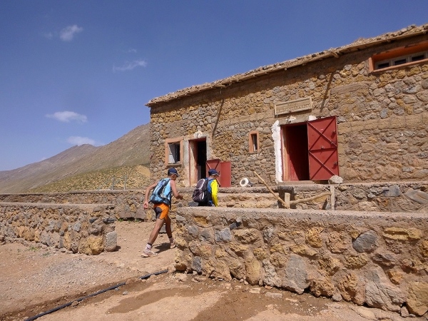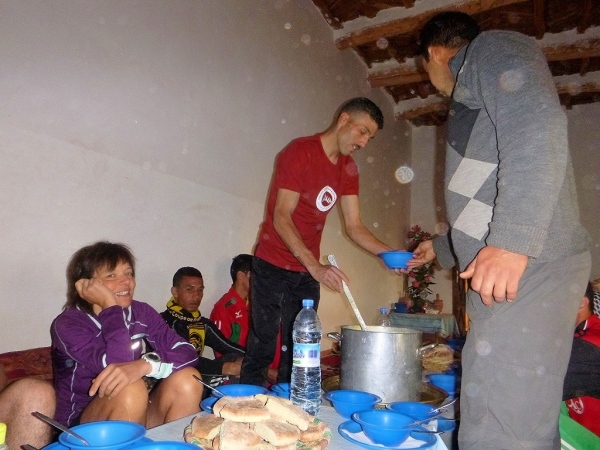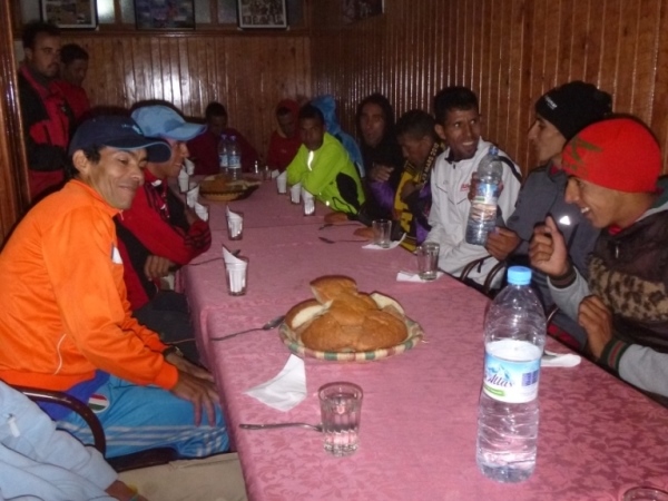 In Agouti, unserem ersten Etappenziel auf 1816 m, übernachteten wir in einer Gite d´ Etape, wie sie hier in den Berge oft zu finden sind. Auch der zweite Tag sollte noch einmal sehr lang werden, bereits um 7 Uhr fiel der Startschuss für diese 58 km lange Strecke. Nicht alle Teilnehmer waren pünktlich, so dass sich der Start etwas verzögerte. Nach einem endlosen Aufstieg von 14 Kilometern erreichte ich den höchsten Berg des TAM, den Tizi Tarkeddid mit 3380 m. Hier oben musste ich im Vorfeld noch einige Schneefelder queren, was ohne Trasse eine ganz besondere Herausforderung war. Noch mit Schnee und Steinen beschäftigt, konnte ich kaum glauben, dass wir bereits den höchsten Punkt erreicht hatten. Ich vergewisserte mich zweimal bei meinen marokkanischen Begleitern Said und Mestapha, denn ich hatte die Höhe gar nicht so sehr gespürt. Wahrscheinlich war ich mit dem Schnee und den vielen Steinen zu sehr beschäftigt! Schon von weitem konnte ich das gleichnamige Refuge (2938 m) erkennen, wo wir uns bei Bedarf mit Getränken selbst versorgen konnten, bevor wir unseren zweiten Berg, den Tizi Rouguelt (3210 m) in Angriff nahmen. Knappe 30 Kilometer musste ich dann noch mit dauerndem bergauf und bergab bis nach Ait Ali N´Itto (1852 m) durchhalten. Würde ich mich noch an die vielen Steine, den losen Schotter und das rutschige Geröll gewöhnen?