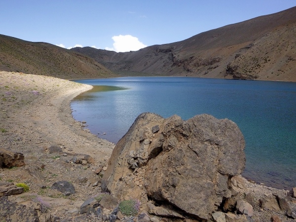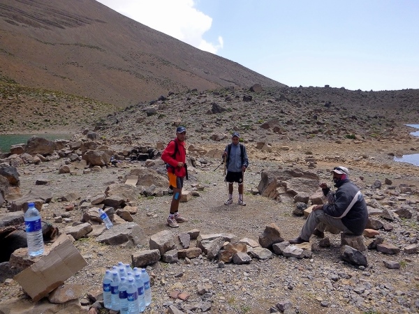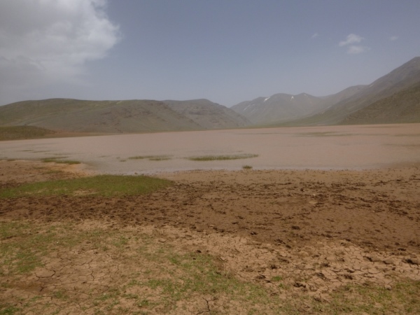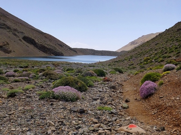 Auch auf der dritten Etappe gab es drei steile Berge. Schon nach 8 Kilometern war ich auf 2466 m, nach 17 Kilometern auf 2364 m und bei Km 27 dann noch einmal auf den Tizi Tamadla mit 2830 m . Dazwischen konnte ich mich im steilen, steinigen Gelände im Bergablaufen üben! Heute kam ich nur langsam die Berge hinauf, weil ich auf dem feinen Schotter mehr nach unten rutschte, als dass ich mich nach oben bewegte. Dafür war dann das Hinunterlaufen im weichen, losen Geröll wirklich super. Schon bald erreichte ich den wunderschönen Hochgebirgssee Lake Tamda auf 2680 m, umrahmt von schneebedeckten Bergen. Sein klares Wasser spiegelte in allen Farben, das Blau schimmerte ganz besonders leuchtend. Hier hatte ebenfalls ein Träger auf seinem Muli Wasser für uns auf den Berg getragen und ich konnte mich noch einmal vergewissern, dass ich genug zu trinken für die letzten 14 Kilometer bis nach Tighza (1922 m) dabei hatte.