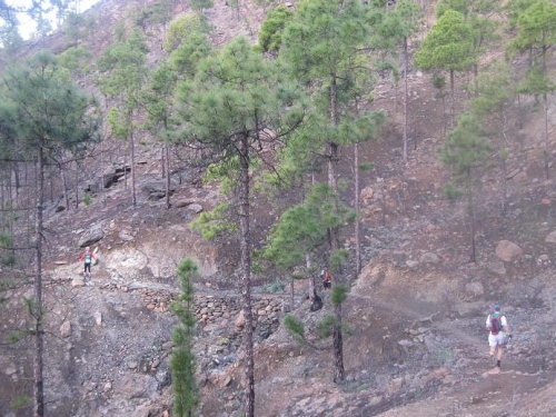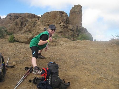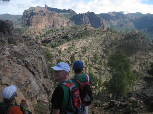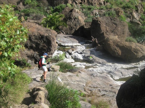 Die gut markierte Strecke führt in einem ewigen Auf und Ab vorbei an Stauseen, Schluchten, Wasserfällen, durch dichtes Gebüsch, über Pipelines und schließlich hinauf zum Wahrzeichen Gran Canarias, dem 1813 Meter hohen Roque Nublo. 4,5h hat uns allein der längste, 1300 Höhenmeter kräftige Anstieg gekostet. Sonnenmilch macht die Runde.