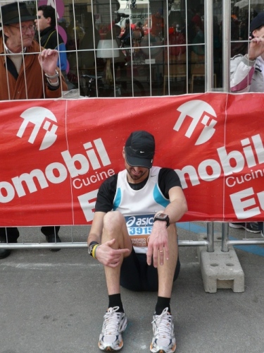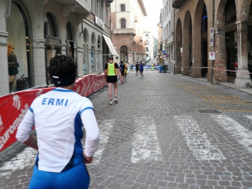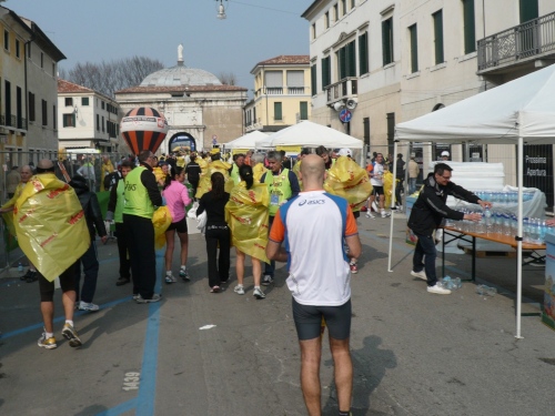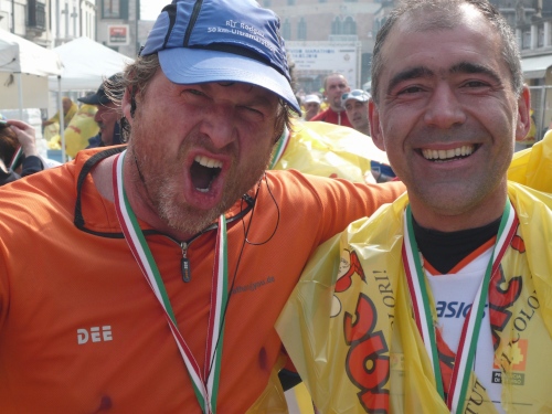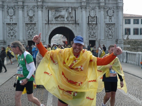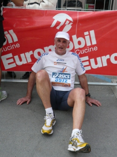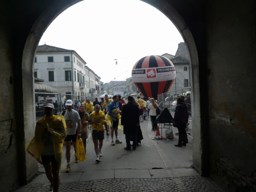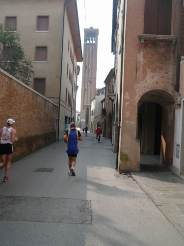 Km 40: Jetzt wird es interessant. Treviso, das Ziel (Arrivo) wird dieses Jahr über die Via Veneto erreicht. Kreuz und quer geht es durch die Altstadt. Das wellige Kopfsteinpflaster schmerzt. Wie weit ist es noch? Vorbei an der Kirche San Francesco ( 2 Euro Münze!) über den Fischmarkt, Piazza San Vito, Piazza dei Signori, Piazza Leonardo, Via Caterina... da ist die Ziellinie,vor dem Stadttor Porta San Tomaso, viele Zuschauer, gute Stimmung und sagenhafte 3:50 Std, zwei Minuten schneller als letzte Woche! Hit-And-Run, ich kam, sah und siegte! Eine gute Strategie.