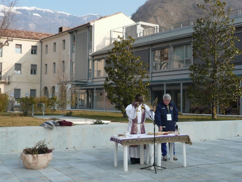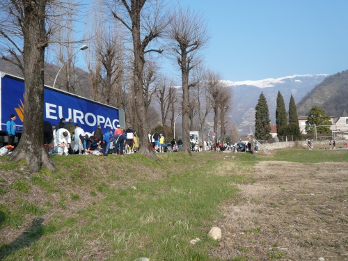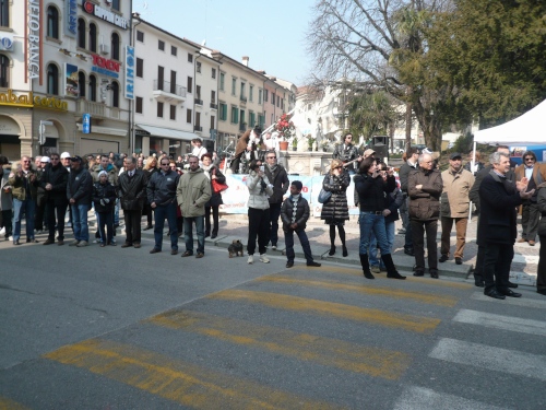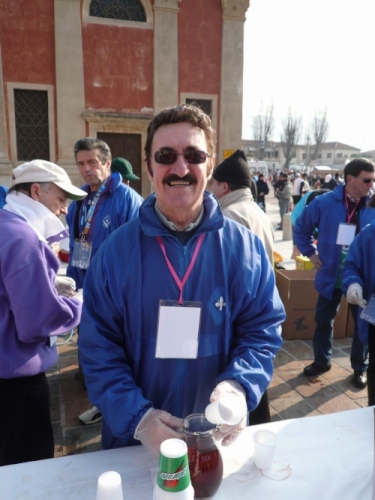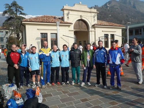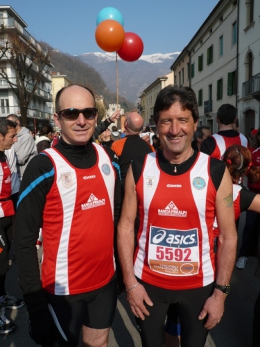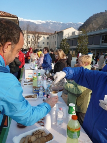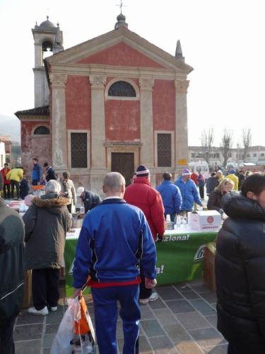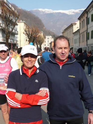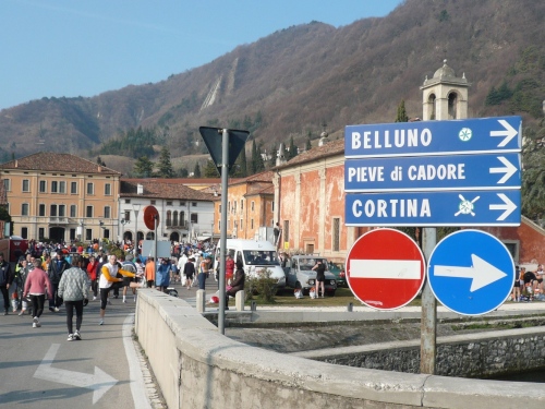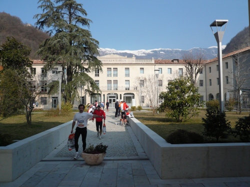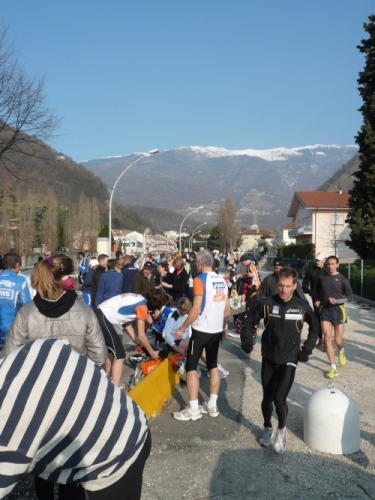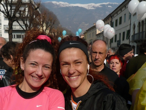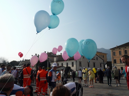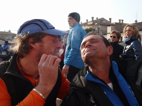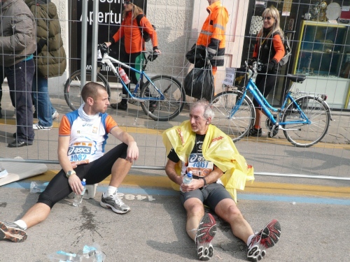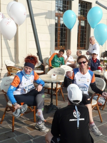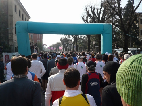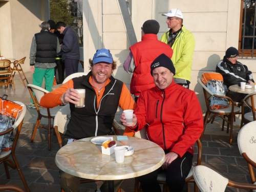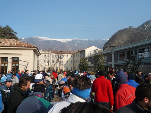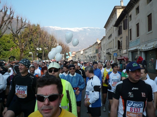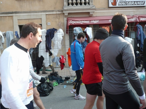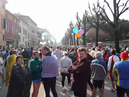 Neu ist bei der siebten Auflage des Treviso-Marathons, dass sich der Start in der Via Cavour im Zentrum befindet. Man versammelt sich auf der Piazza Foro Boario. Abgabe des Kleiderbeutel (Sacce) in den vielen Lastwagen. Es ist noch viel Zeit bis zum Start um 9:45. Es wird eine Messe gelesen, es gibt warmen Tee, Kekse, Marmelde und viel, viel wärmende Sonne vor dem Bergpanorama. Ich sitze dort auf der Piazza mit Rainer und genieße die Atmosphäre bei einem schönen Latte Macciato. Da kommt Sabine, überglücklich mich samt ihren Startunterlagen gefunden zu haben. Es fällt schwer, diesen wunderschönen Platz zu verlassen, aber da ist halt noch ein kleiner Lauf zu absolvieren.