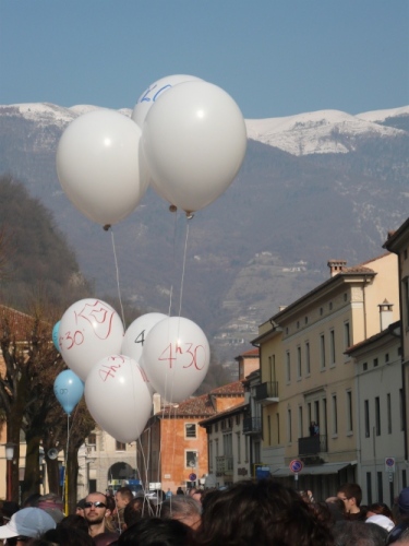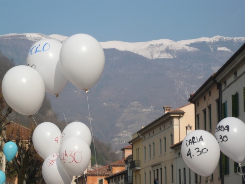 Der nächste Ort ist Spresiano Villorba bei km 28. Da trappelt ein Pulk mit Luftballons an mir vorbei. Ich lese 5:20. Das kann doch nicht wahr sein! Dann lese ich noch 3:45. Ach so! Ja, da ist er ja, aber der war ja dann hinter mir!