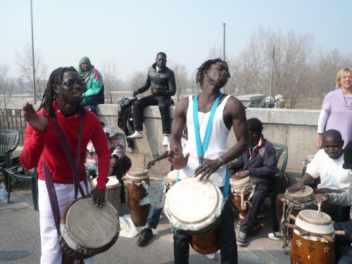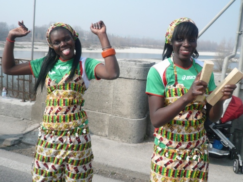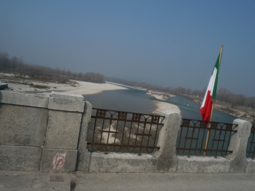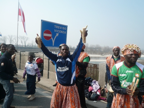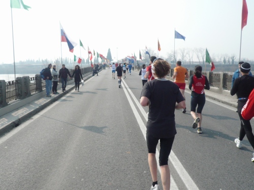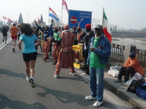 Hinter Susegana ist die Halbmarathonmarke. Mit sagenhaften 1:49 netto rausche ich über die Matte. Wir überqueren den Fluss Piave. Absolut heisse Stimmung. Die buntbeflaggte Brücke ist fest in Afrikanischer-Brasilianischer Hand. Hier hielt sich Ernest Hemingway gegen Ende des Ersten Weltkriegs auf. Am 8. Juli 1918 schlug eine Bombe der k.u.k. Armee neben ihm ein, während er den Soldaten Schokolade, Zigaretten und Postkarten lieferte. Als er später einem Verletzten helfen wollte, wurde er angeschossen (siehe Roman „In einem anderen Land“).