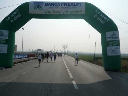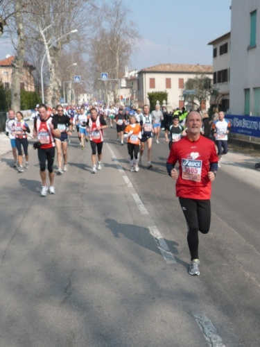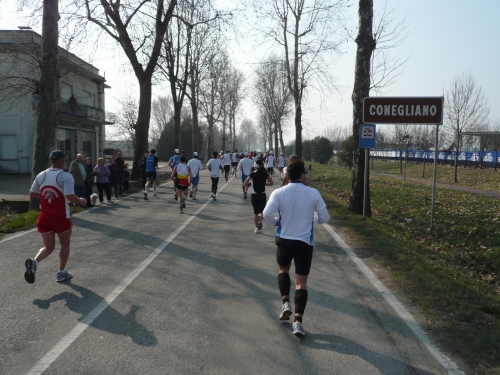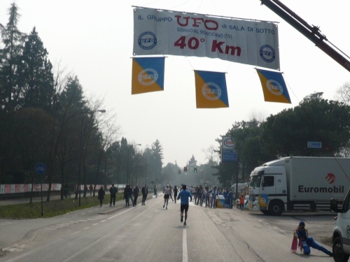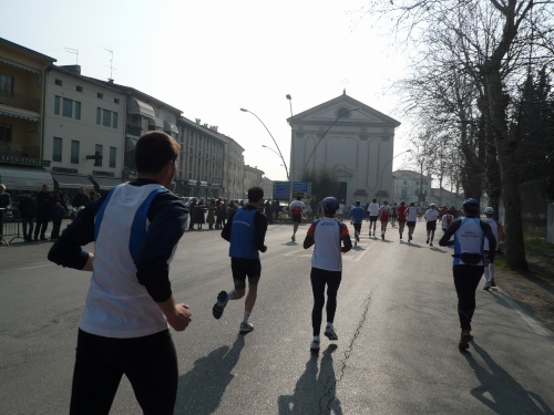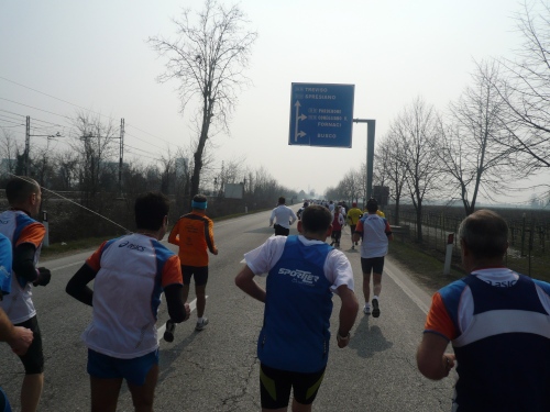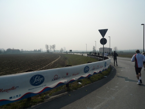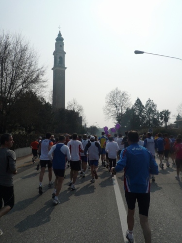Bei km 33 das Städchen Villorba, noch klebe ich am 3:45er Pulk dran, doch mein schneller Lauf von heute und von letzter Woche fordert nun seinen Tribut: Ich muss die Masse ziehen lassen.