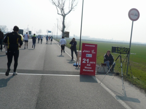 Km10: 49 Minuten! Jetzt bin ich scharf und lass die Beine fliegen. Die Strecke ist unerotisch, es gibt nichts zu sehen. Schnurgerade, einer alten Römerstrasse folgend geht es gen Süden. Glatte Strasse, kein Bordstein, kein Absperrgitter, keine Kurve behindern meinen Lauf. Es ist herrlich. Temperatur 8-10 Grad, Sonne pur, frische Frühlingsluft und schnelle Strecke. Viel, viel Zuschauer stehen an der Strecke, was für ein Unterschied gegenüber dem letzten Jahr, als der Lauf im Regen versank.