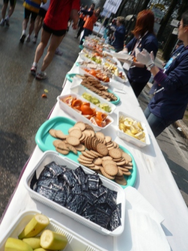 Alle 5 Kilometer gibt es Wasser aus Flaschen, die man sich in voller Fahrt greifen kann, dazu Früchte, aber dieser martialische Pacemaker kennt keine Gnade und läuft bei km 30 einfach durch! Zusätzlich gibt es Schwammstationen. Ich brauche jetzt wirklich diese Dinger, ich laufe an meinem absoluten Limit und greife bei voller Fahrt nach den triefenden Teilen.