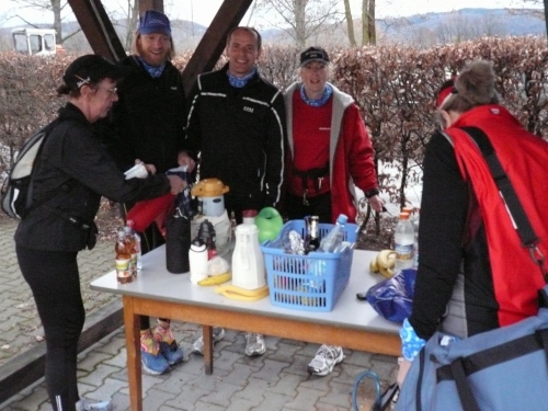 Verpflegung muss jeder selbst mitbringen. Als germanischer Siegfried habe ich ein sexy Plasikkörbchen, in den Farben der Saison: Wasser, Instantbrühe, Bier mit und ohne, Nüsse, Red Bull, Powergel,Gummibärchen und Hühnchenfleisch. Alles Nahrungsmittel, die ich beim 50er Halunkentreff, letztes Wochenende erprobt hatte, und die einem nahezu unverwundbaren Kämpfer gerecht werden.