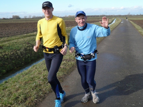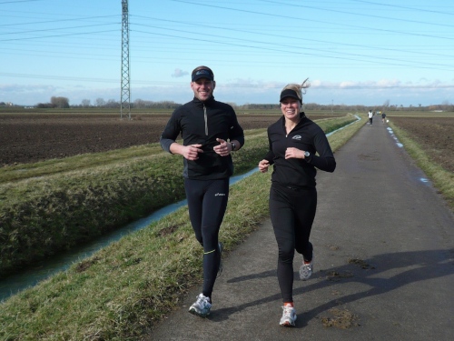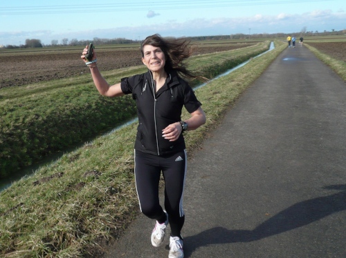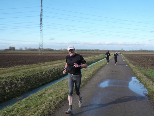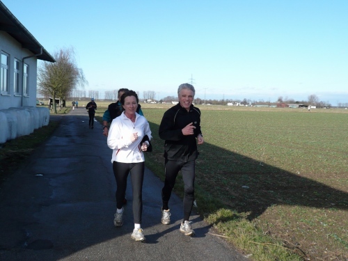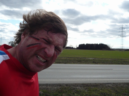 Schlammbesudelt machen wir zwischen den sauberen Mitläufern schnell ein Startfoto und laufen los in die Felder. Die Strecke ist überwiegend asphaltiert, es gibt ein Begegnungsstück mit Wendemarke und dann kommt ne schöne Schlammschlacht. Alle schauen rüber zu den versunkenen Streitwagen und können vor Lachen kaum noch laufen.