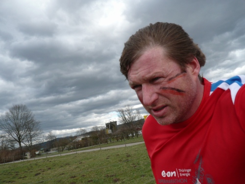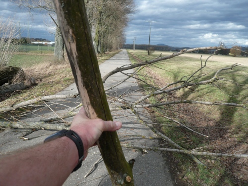 Es ist ein unbeschreiblicher Kampf. Extrem schwieriger als beim Sturmmarathon 2004 in Frankfurt. Als ich an der Pappelallee entlang laufe, fällt ein riesiger Ast herab, springt krachend vom Asphalt nach oben. Instiktiv reisse ich beide Arme hoch und wehre das Monster mit meinen germanischen Unterarmen ab. Ein schnelles Beweisfoto und der Feldzug geht weiter. Ja, es zieht auf dem Feld. Mit aller Kraft lehne ich mich gegen die gewaltige Naturkraft und kämpfe mich durch.