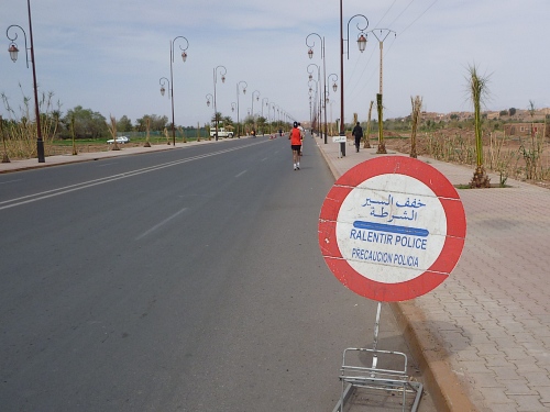 Wer glaubt, er würde ab km 2 nichts trinken müssen, sei gewarnt: es ist verdammt trocken hier, der rissige Mund signalisiert Alarm, doch die Halbliterflaschen liegen verstreut auf der Strasse. Nichts mehr für langsame Marathonläufer, die Berberfinken haben zugeschlagen. Ich lege also einen Zahn zu. Nach 3 Kilometern habe ich Wasser, denn es gibt immer mehr Geher. Von nun an gibt es bis km 15 alle 1-3 Kilometer Wasser - für denjenigen, der auf 3:45 läuft. Fragt mich nicht wie, aber ich bin nach 6 Kilometern in dieser Zeit. 17 Grad zeigt die Reklametafel der Bank, es werden noch 30 Grad werden. Ich greife mir eine der im Ganzen angebotenen Apfelsinen. Wasserflasche, Fotoaparat und Apfelsine, mir schmerzen die Schultern.