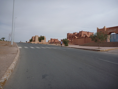 Die N 9, auf der ich vom Hohen Atlas heruntergefahren war, ist nun für die nächsten Kilometer unsere Laufstrecke, erfüllt vom Zweitacker- und Dieselduft. In diesem Land liebt man Abgase und den Kampf mit den Motoren. Ich bin schon viel gelaufen, ich nehme das als knallharten Trainingslauf in einer Welt aus tausendundeiner Nacht. Und der beginnt verschärft ab km 15. Rechts geht es ab zu den Atlas Studios in die Wüste.