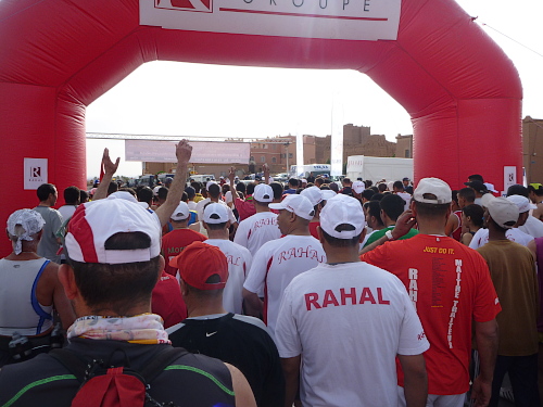 Sekunden vor dem Start bewirkt das arabische Imponiergehabe, dass sich der gesamte Pulk noch vor der Freigabe über die Startlinie begibt. Die in der Startnummer integrierten Chips verursachen ein Computerchaos. Höllisches Gedränge, während die paar Europäer sich da raus und im Hintergrund halten.