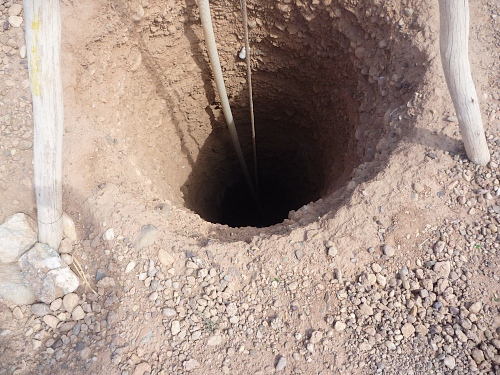 Es gibt sehr viele Wasserstellen, Quadfahrer patrollieren in der Steinwüste, bieten Wasser und Datteln an. Es ist verdammt heiß, eine trockene Hitze. Noch schlimmer ist die Psyche. Hier läuft man mit dem Kopf. Das ist mein 175ter. Immer wieder gibt es Grenzen. Hier ist so eine. Ein bunter Rinderschädel markiert die Strecke.