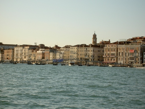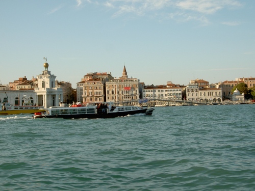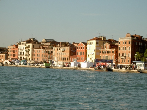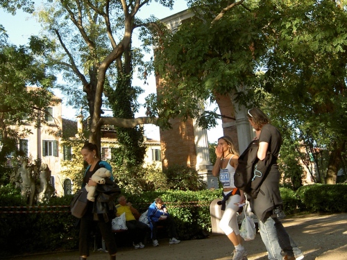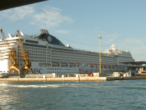 Wir drehen nach rechts in das Hafengebiet. Am Tronchetto liegen vier oder fünf Kreuzfahrtschiffe, darunter auch ein wirklich riesiges italienisches Schiff. Hier gibt es wieder einige Bäume, die etwas Schatten spenden. Ende der siebziger Jahre war hier noch ein Güterbahnhof, auf dem ich die letzten Dampflokomotiven im Einsatz sah. Wir laufen nun zwischen Hafen und Wohngebieten, einer Gegend, in die sonst nur eingefleischte Venedig-Liebhaber kommen. Leider gibt es hier auch keine Zuschauer.