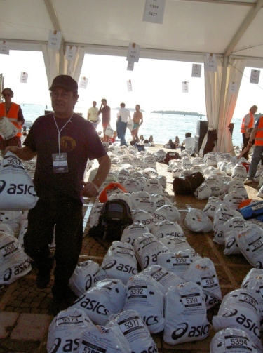 Nach 20 Minuten sind die Beine ziemlich weich und als wir anlegen, warten schon Sanitäter auf eventuelle Kunden. Nebenan stehen die Busse nach Mestre und zurück an den Start nach Stra. Unser Bus nach Stra fährt dann auch sofort ab und nach 40 Minuten sind wir am Startplatz bei der Villa Pisani. Ganz schön weit. Die Strada Statale ist schon wieder gereinigt und die meisten Luftballons sind weggeflogen.