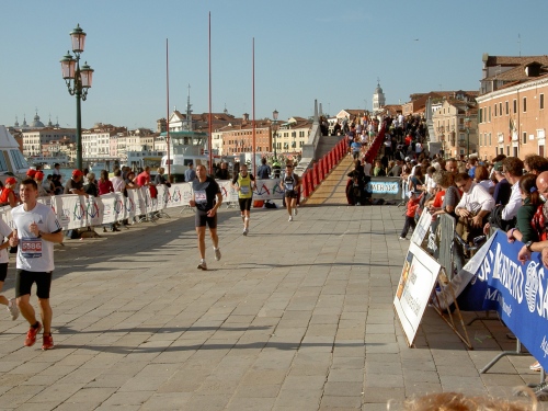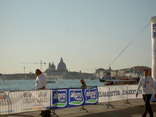 Kurz vor der Basilica della Salute, am Canale Grande gibt es einen Bauzaun, dessen Ende ich nutzen will, um einen Läufer zu überholen. Dummerweise ist zwar der Bauzaun zu Ende, aber dafür schau ich ins Wasser. Gerade noch abgebremst. Von der angrenzenden Punta della Dogna geht es über eine große Pontonbrücke nach San Marco auf der anderen Seite des Canale Grande. Diese Brücke wird nur für den Marathon aufgebaut und ist so hoch, dass die Vaporetti-Boote unter ihr hindurch fahren können. Wirklich beeindruckend. Von oben kann man wunderbar die Riva vom Markusplatz bis zu dem Park sehen, an dem das Ziel ist. Das sieht noch ziemlich weit aus.