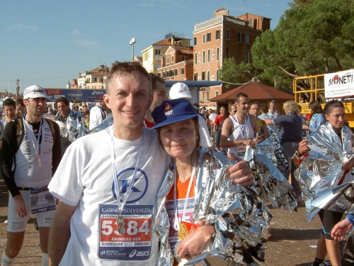 Viele Läufer müssen nun gehen. Mir geht es noch ganz gut. Ich muss mich aber anstrengen, um meine Pace laut GPS zu halten. Am Ende der Brücke sieht man eine Anzeigetafel über der Straße, die einfach nicht näher kommen will. Ich versuche, die Lichtmasten zu zählen, es sind aber zu viele. Dann fällt mir noch auf, dass der Teer unheimlich grobkörnig ist. Das Ganze ist noch stupider, als das schnurgerade Stück im Prater in Wien. Außerdem gibt es dort Musik aus Lautsprechern. Das wäre hier eine gute Ergänzung - die längste Musikmeile der Welt? Auf der Brücke kommt dann die 35 Kilometer-Verpflegungstelle, an der ich nur kurz halte. Für viele Läufer ist es aber die Rettung. Der Blick auf Venedig ist ganz nett, aber man kommt einfach nicht voran. Ich fange an zu rechnen. Vor uns kommt noch ein Anstieg durch eine Straßenüberführung, danach gibt es ja noch einige Brücken in Venedig selbst. Die Beine fangen an, schwer zu werden. Bei Kilometer 36 fällt mir auf, dass mein GPS schon bei 36,4 km ist. Ich muss also noch die Zeit für 400 Meter dazu addieren. Warum fällt das Denken eigentlich so schwer?