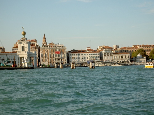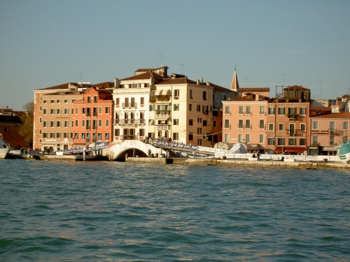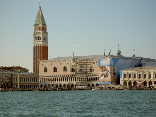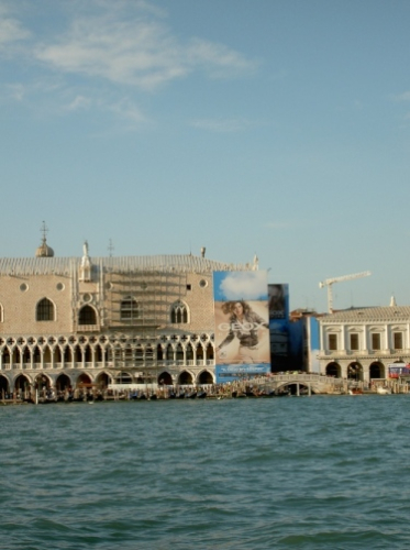 Wir kommen bei den Giardi Ex Reali ganz in der Nähe von Harrys Bar im Viertel San Marco an. Ab hier ist wirklich die Hölle los. Wir werden angeschrien, dass der Boden durch Wurzeln wellig ist. Und weiter geht’s. Am Dogenpalast geht es zur nächsten Brücke, der Ponte della Paglia, von welcher man einen Blick auf die Seufzerbrücke hat. Diese wird zurzeit renoviert und ist von Reklametafeln so furchtbar entstellt, dass es schon wieder interessant ist. Davon bekomme ich aber jetzt nichts mit. Diese Brücke ist normalerweise schon immer dicht bevölkert; jetzt hat man uns eine Gasse freigehalten. Diese Brücke hat keine Holzrampen, sondern besteht aus breiten Stufen, die auf unserer Seite mit Plastikkeilen begradigt sind. Da kann man ganz schön ins Trudeln kommen.