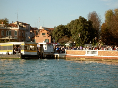 Im Park ist alles ist perfekt organisiert. Kaum habe ich aufgegessen, wird mir auch mein Plastikteller schon abgenommen und entsorgt. So weit ich das sehe, kann man auch ohne Gutschein noch einen Nachschlag bekommen, die Leute sind sehr freundlich. Gleich nebenan fahren die Boote zum Tronchetto ab. Wir müssen nicht lange warten und finden einen Platz an der Reling. Von dort haben wir noch mal einen schönen Blick auf unsere Laufstrecke in Venedig und die Pontonbrücke. Wir sehen noch die letzten Läufer, welche mit 6:16 auch noch gewertet werden.