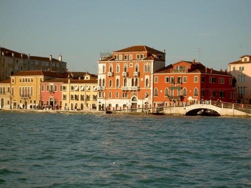 Wir sind auf dem Fondamenta Zattere am breiten Guidecca-Kanal. Hier ist es immer recht schön und nicht ganz so touristisch überlaufen. Ein Lokal besitzt Tische am Kanal und ein Kellner möchte mit seinen Tellern noch schnell vor mir den Laufweg kreuzen. Im letzten Moment kann er bremsen.