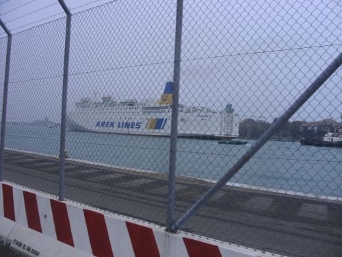 Zunächst bekommen wir nicht die schönste Seite von Venedig zu sehen. KM 37 sind wir noch auf der Brücke, dann geht es rechts ab und KM 38 sind wir im Hafenbereich. Über einen KM laufen wir hier, KM 39 ist an der Statione Marittima. Hier liegt ein gro-ßes Kriegsschiff. Der eben erwähnte Kreuzfahrer zieht vorbei und es kommt endlich die erste der 14 Brücken.