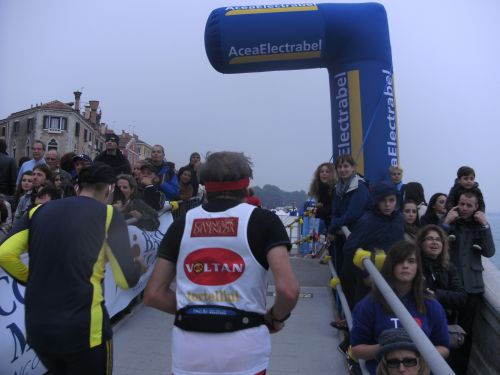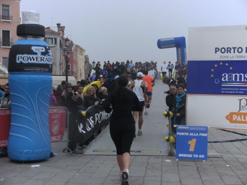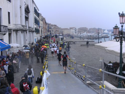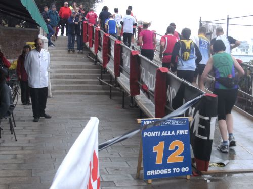 Vor jeder Brücke steht ein blaues Hinweisschild mit der Zahl der noch bis zum Ziel zu überlaufenden Brücken. Leider hat es schon auf der Ponte della Libertà angefangen zu regnen. Trotz des Regens sind die Stege jedoch gut zu überlaufen. Es sind bis zur Chiesa della Salute nur wenige Zuschauer an der Strecke. Die Strecke ist nun nicht mehr asphaltiert, aber die großen Steine als Untergrund sind trotz der Glätte durch den Regen gut zu laufen. Jedenfalls bei meinem lockeren Traben. Aber die Schnellen kamen ja noch im Trockenen rein.