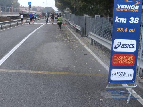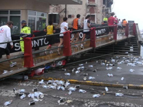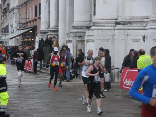 Hochwasser, Acqua Alta, ist der Grund dafür, dass es nicht über den Markusplatz geht. Die Entscheidung fiel erst am Renntag um 7:30 Uhr. Die Rennleitung hatte aber für diesen Fall einen ebenfalls AIMS- vermessene und anerkannte Marathonstrecke parat. Es gab unterwegs eine kleine Änderung, die mir als Läufer nicht auffiel. Vielleicht die kurze Wendestrecke im Parco San Guiliano? Das Überlaufen des Markusplatzes ist den Läufern nun für die nächste Auflage am 23. Oktober 2011 in Aussicht gestellt.