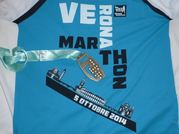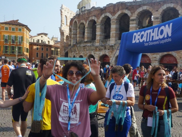 Ich freue mich schon auf die Ankunft von Saeckwo. Wann ist man schon mal vor einem Marathonsieger im Ziel? Die Medaille ist sehr hochwertig. Sie zeigt einen Blick von oben auf die Marktschirme der Piazza Erbe, Hauptplatz von Verona und ehemals römisches Forum.