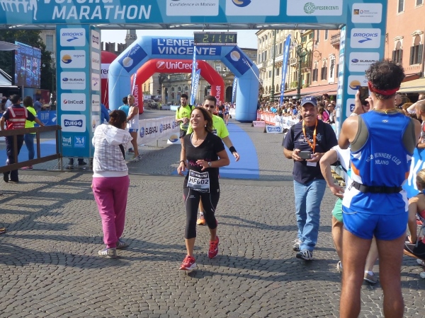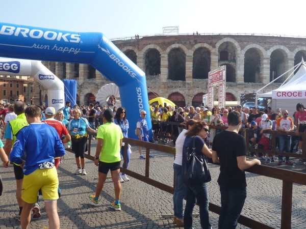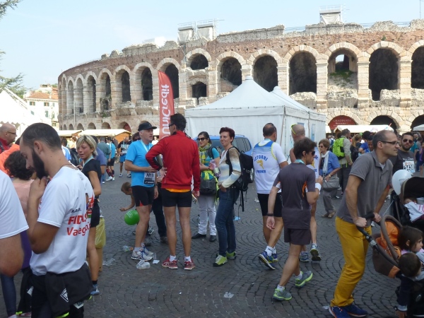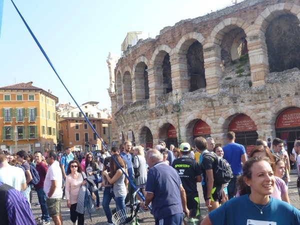 Wir drehen beim Castelvecchio auf die Via Roma und sind ruckzuck beim Ziel vor der Arena. Hier ist dann mal richtig was los. Die Zeitung L'Arena titelt denn auch am nächsten Tag: „Maratona, una festa per la città“ (Ein Fest für die Stadt).