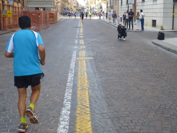 Bei km 20 überholt uns der im Marathon führende Kenianer Saeckwo Alex Chepkwik. Hinter ihm liegen schon 39 km. Die fehlenden Kilometer muss er noch in der Stradone Porta Palio zurücklegen und sieht noch das klassizistische Stadttor Porta Palio aus dem 16. Jahrhundert, einst Schauplatz des traditionellen Pferderennens.