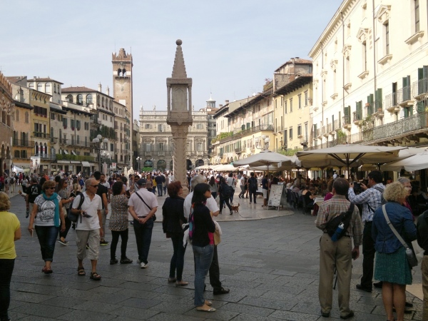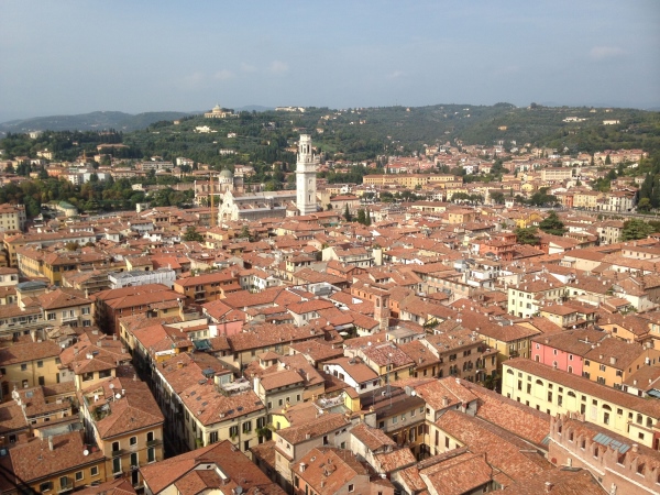 Der bürokratische Wasserkopf ist unübersehbar und zeigt sich auch am Nachmittag: Für Marathonis soll es in allen städtischen Museen einen reduzierten Eintritt von 1 € geben. Wir wollen mit dem Aufzug auf den Glockenturm Torre Lamberti fahren, normalerweise kostet das 8 €. An der Kasse legen wir unsere Startnummern vor. Die Kassiererin weiß ungefähr, worum es geht, muss sich aber erst mal telefonisch absichern und nach den Modalitäten fragen. Die Schlange hinter uns wird immer länger. Letztendlich erhalten wir unseren reduzierten Eintritt. Seltsamerweise kommen die Nicht-Sportler hinter uns ohne große Komplikationen auch für 1 € auf den Turm: Am 1. Sonntag des Monats gilt nämlich für alle Besucher ein ermäßigter Eintrittspreis von 1€, wie wir später erfahren. Aber wir sind ja Marathonis, und die wollen extra verbucht sein. Ordnung muss sein. Die Italiener haben die Deutschen in Sachen Bürokratie schon lange überflügelt.