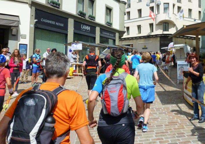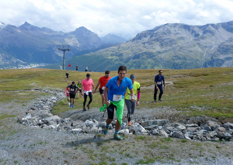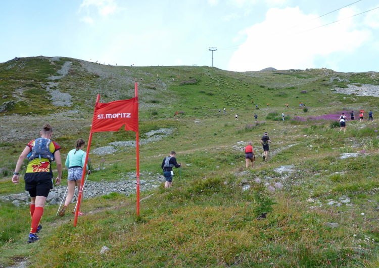 Nicht ganz in die Karten spielt uns allerdings das Wetter. Anfang der Woche waren sogar 60 l Regen auf den qm angedroht, was sich später deutlich relativieren sollte. Aber die Organisatoren, so die sympathische PR-Chefin Gabi Egli, haben für den Fall die Fälle einen Plan B in der Tasche: Das Ausweichen auf eine Alternativroute. Die neue Strecke würde vom Start im Dorfzentrum von St. Moritz analog der bisherigen Strecke bis zur Bergstation Salastrains (Munt da San Murezzan) führen und von dort zum höchsten Punkt auf 2.686 m und im Anschluss noch bis zur Corviglia auf 2.488 m. Das wären dann anstatt 980 HM über 5,5 km deren 840 HM über 8,2 km. Die Siegerehrung und Finisher-Party würden wie geplant auf dem Piz Nair stattfinden und die Teilnehmenden kostenlos von Corviglia bis auf den Piz Nair und retour ins Dorf transportiert. Über die tatsächliche Route würde erst kurz vor dem Start entschieden.