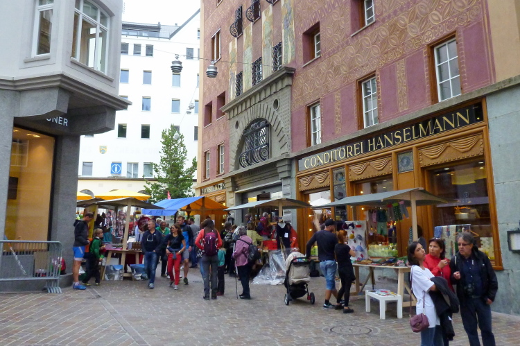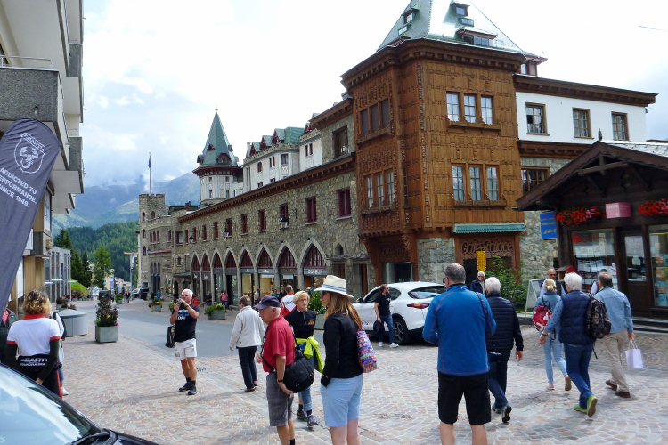 Unter dem Beifall zahlreicher Passanten schießt uns Anne-Marie um Punkt 13 Uhr die Fußgängerzone hinauf. Elke wird, wie zahlreiche andere Begleitpersonen auch, drei verschiedene Bergbahnen nach ganz oben nutzen. Nach der breiten Strecke zur unteren Bergbahn geht es links eine schmale Treppe hinauf. Das heißt, es könnte gehen, aber es ist erst einmal Stau angesagt, der sich auch so schnell nicht auflösen kann. Merke: Willst Du etwas reißen, mußt Du ganz weit vorne stehen. Die Treppe endet nach rund 700 m, danach wechseln wir auf eine laufbare Asphaltstraße. Schnell gewinnen wir an Höhe und schon bald können wir über den Dächern der Stadt erstmals den St. Moritz See bewundern.